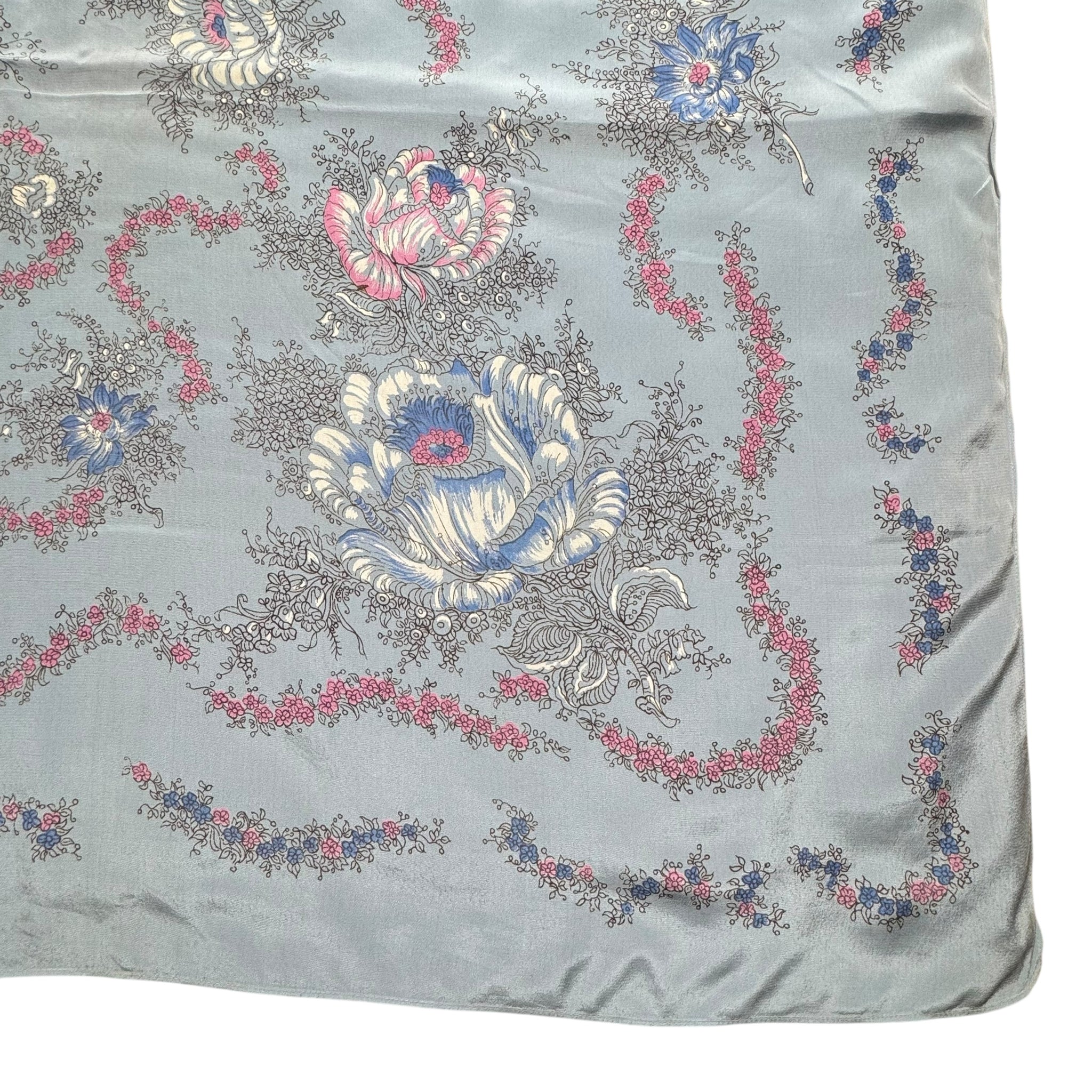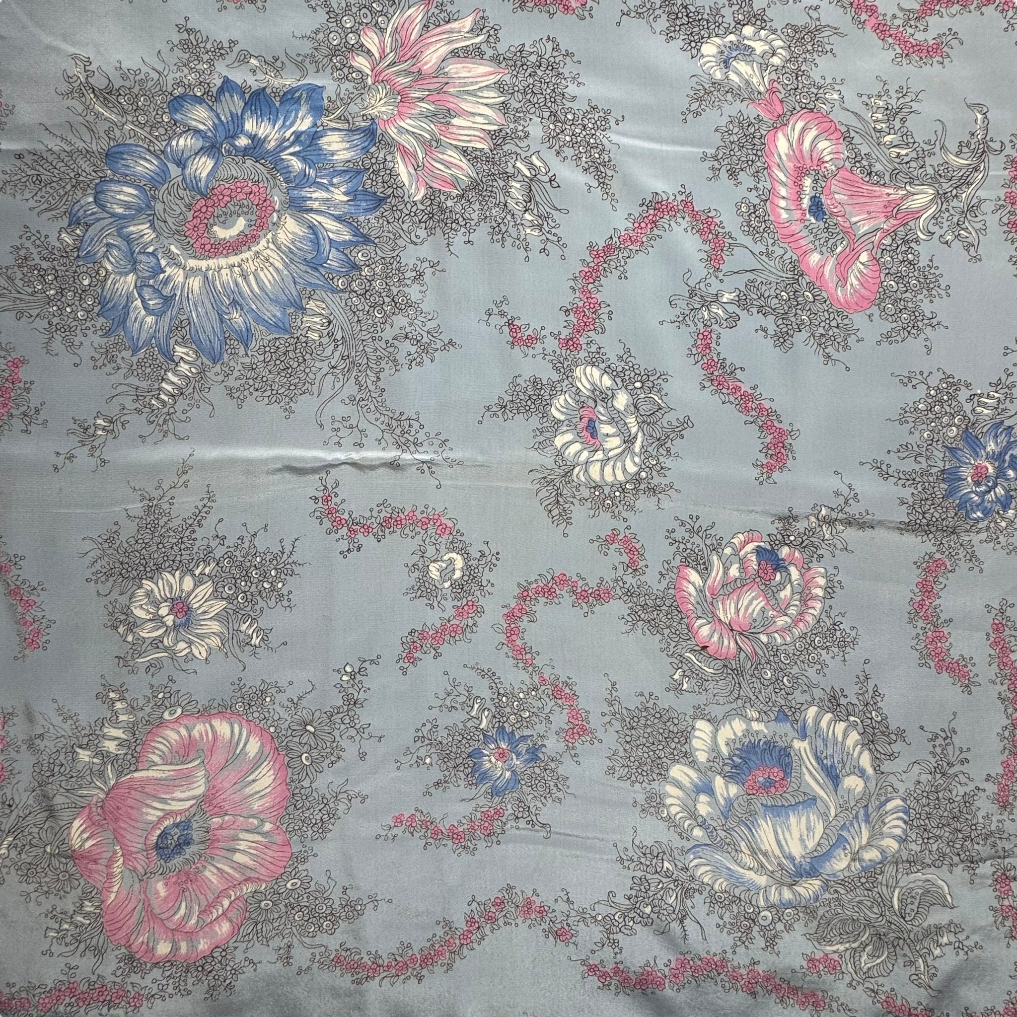 Made from delightfully cold to the touch silk crepe it has a pale blue base with a pretty floral design worked in pink, white and black.