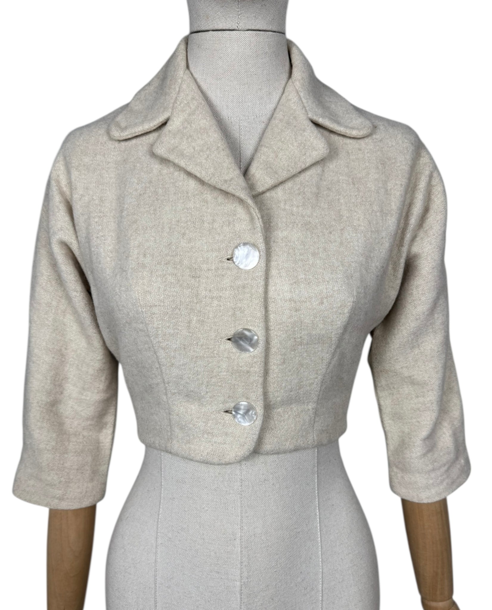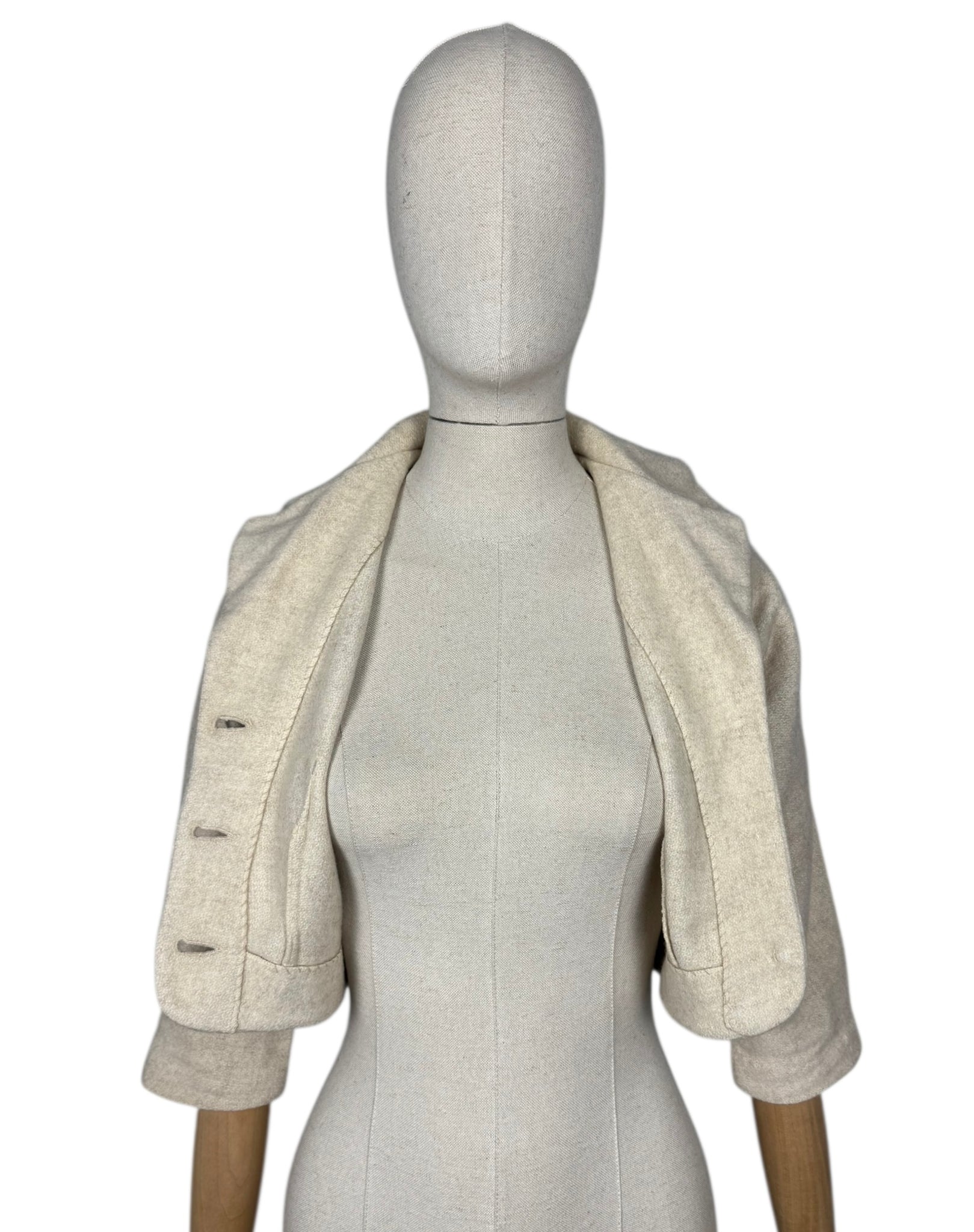Made from pure wool, in a slightly marled shade of oatmeal, it is a very close fitting cropped jacket featuring three-quarter length sleeves, 3 large pearlised buttons and a smart collar. It is unlined.