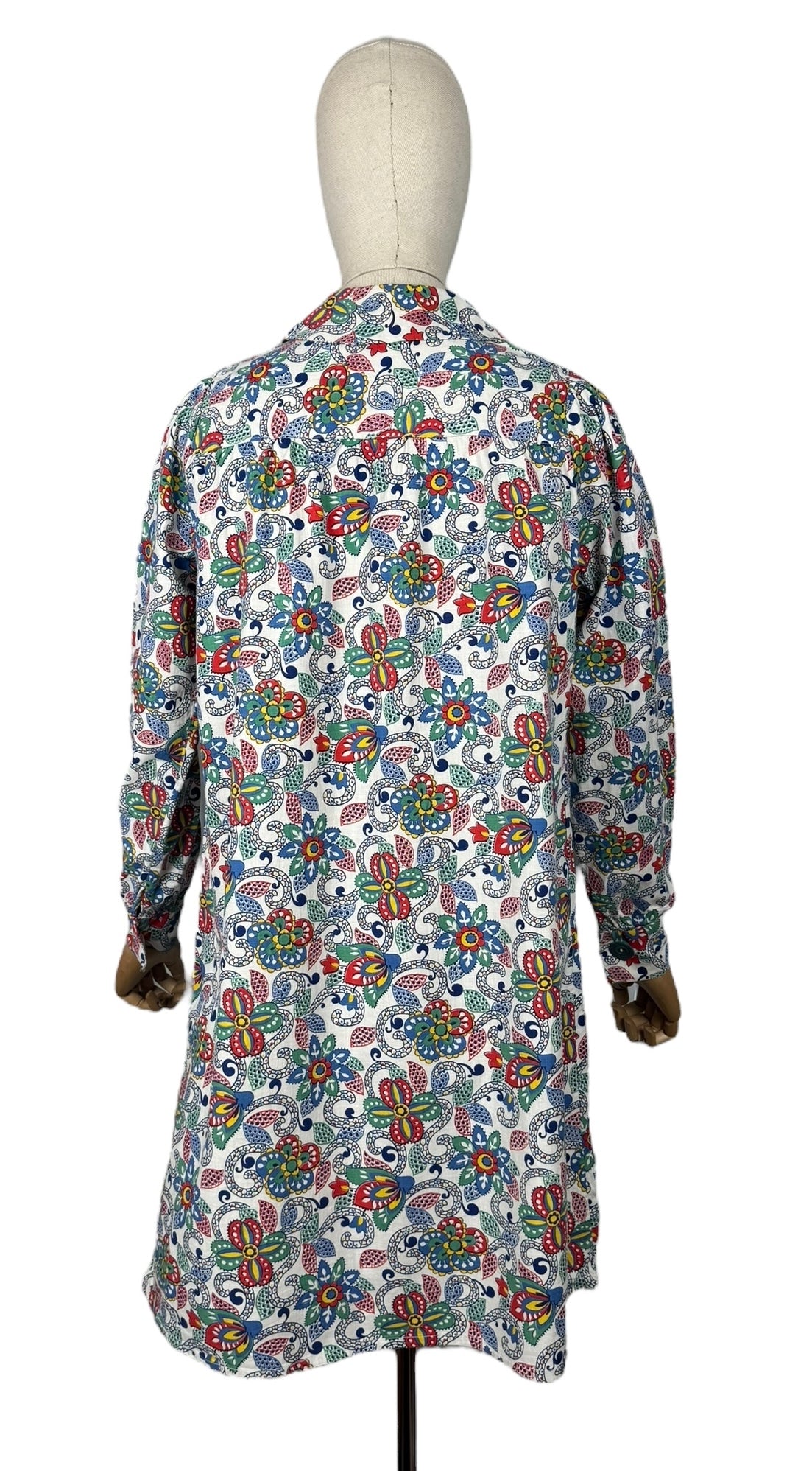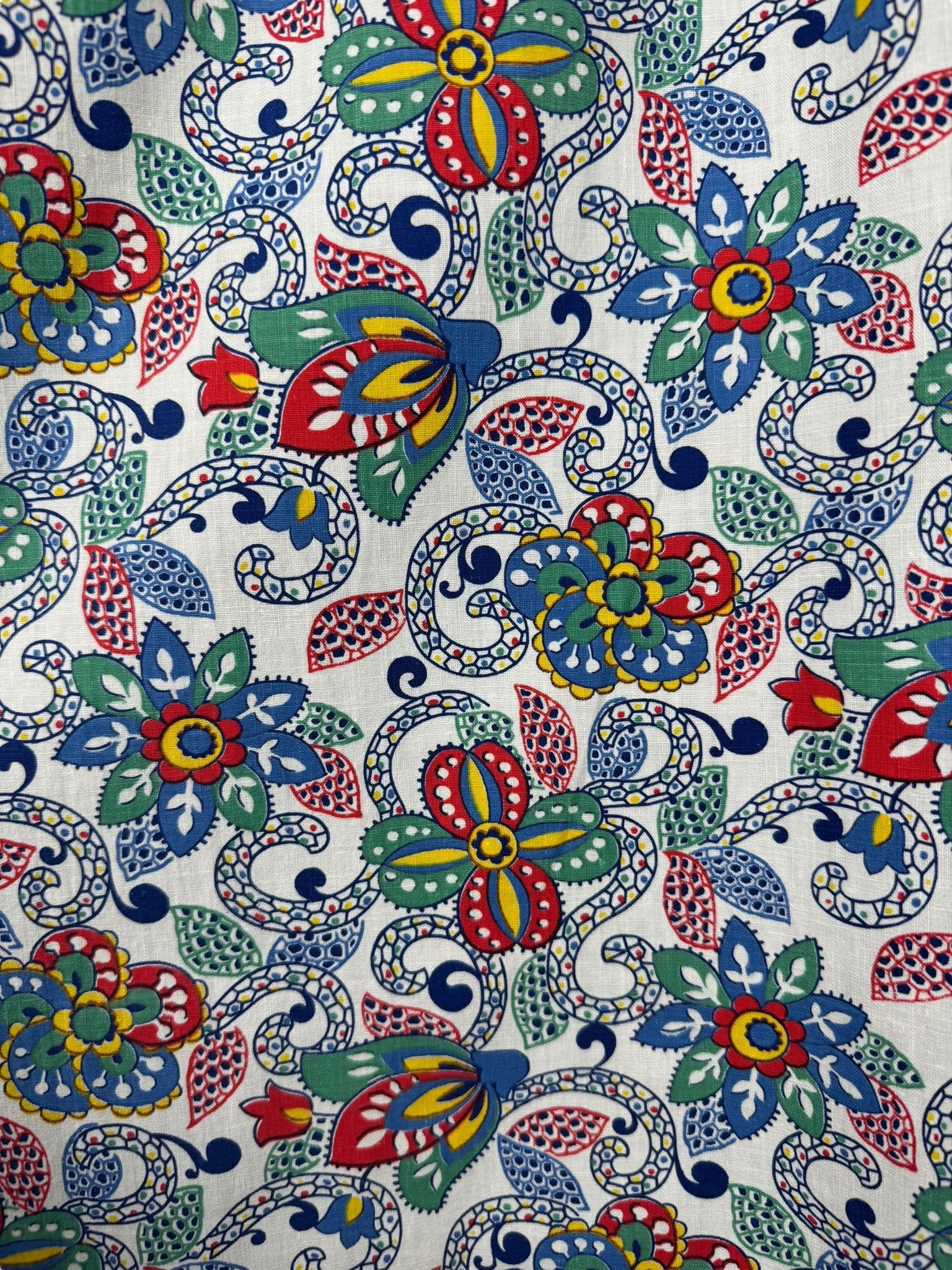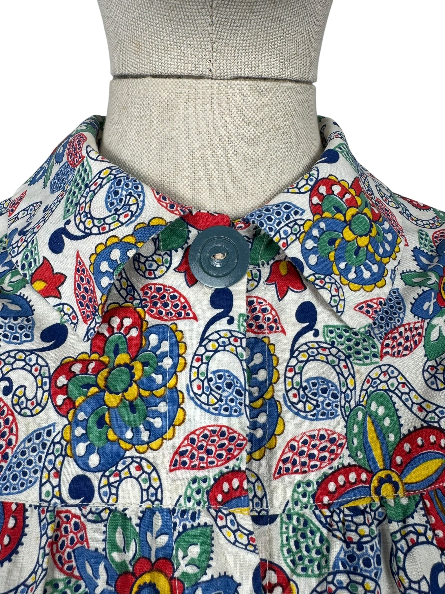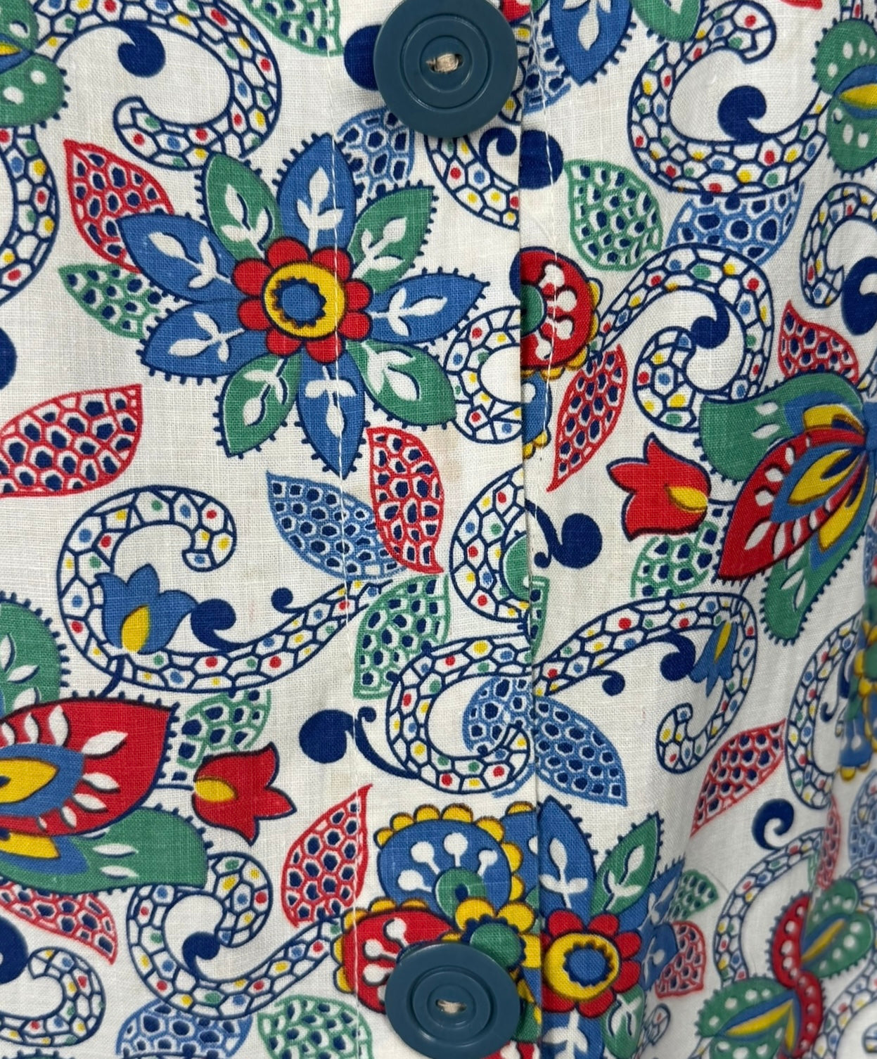 Made in the 1930's, it is made from crisp white cotton with a bright floral print in blue, green, red and yellow.