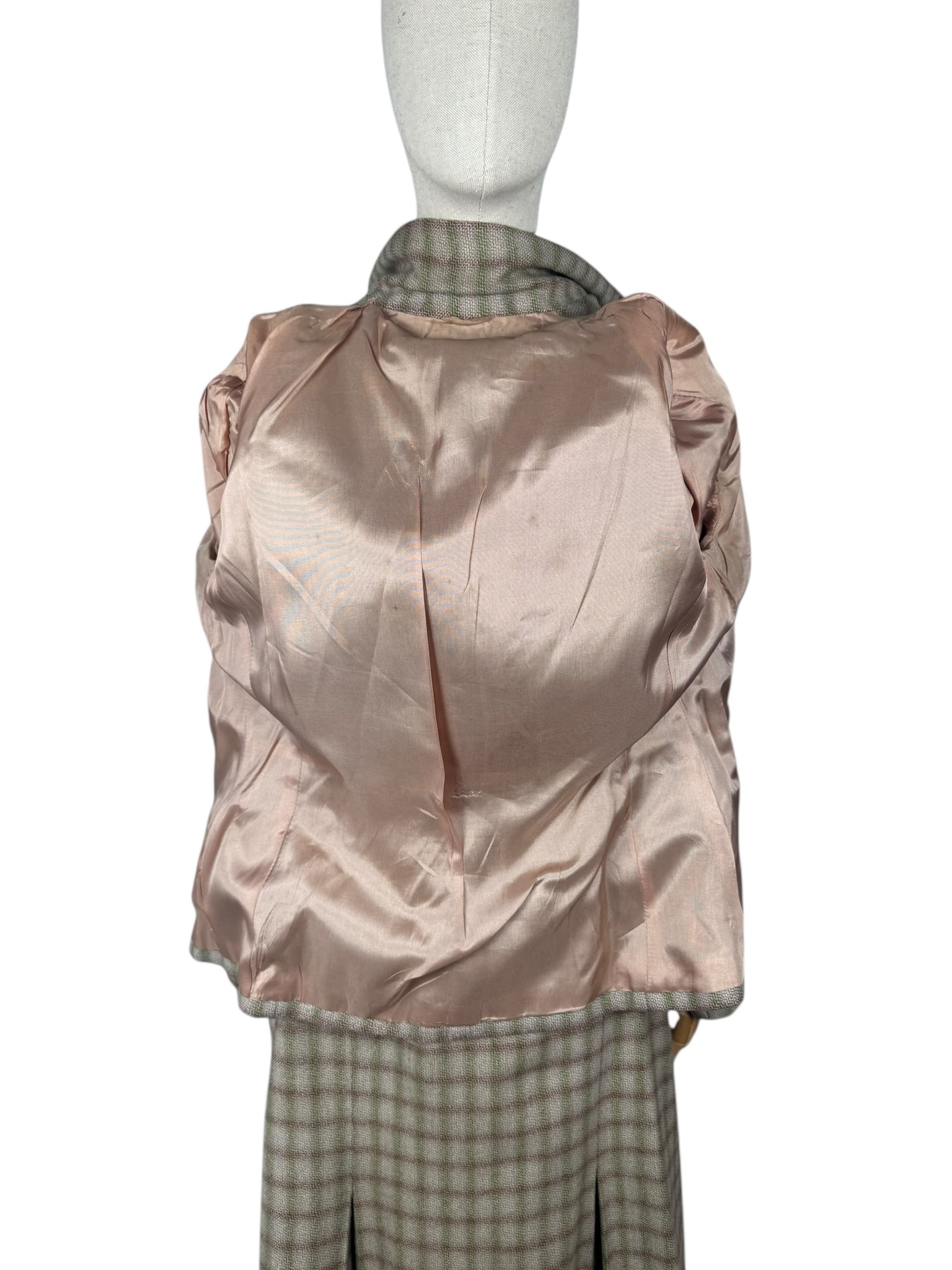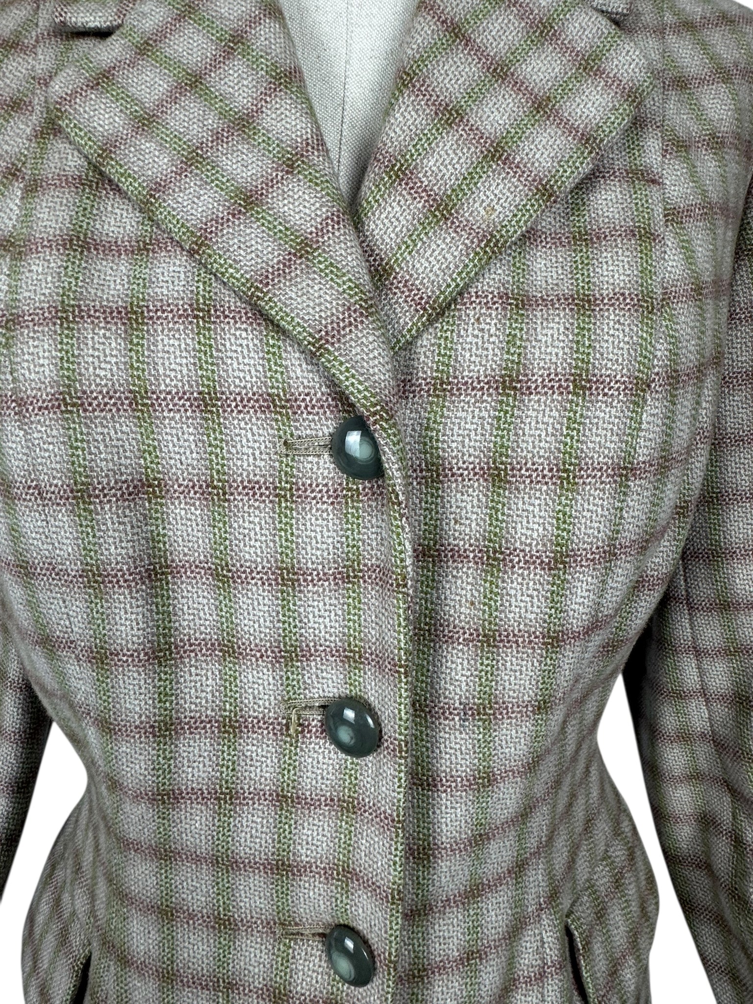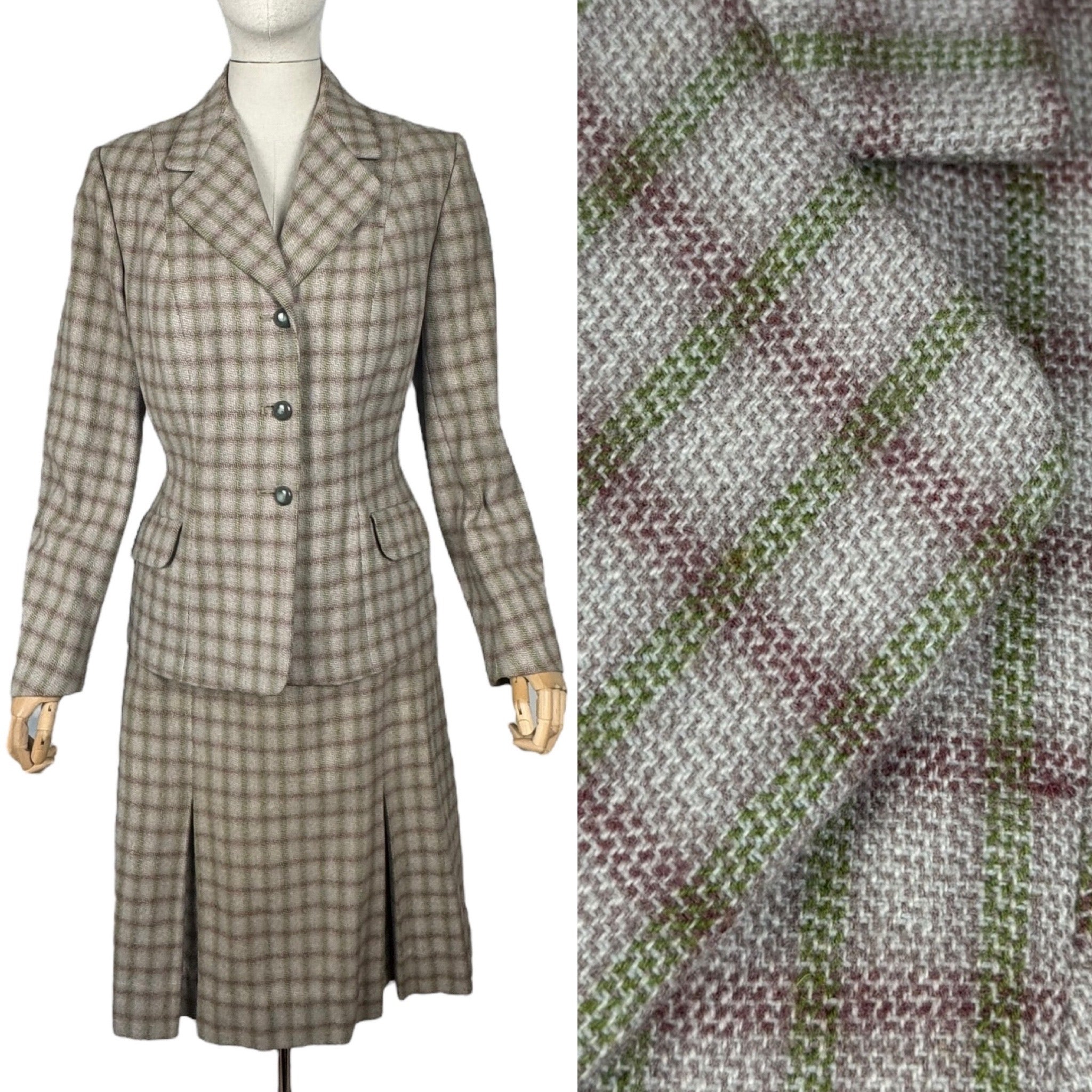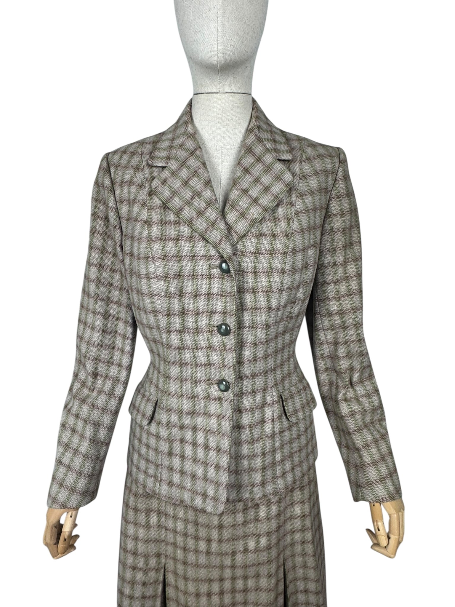 Made from medium weight wool it features a green and burgundy check on an off-white and dusky pink base. The jacket is beautifully tailored and features green button closure, has firm shoulder pads to give you the classic silhouette of the era and is fully.