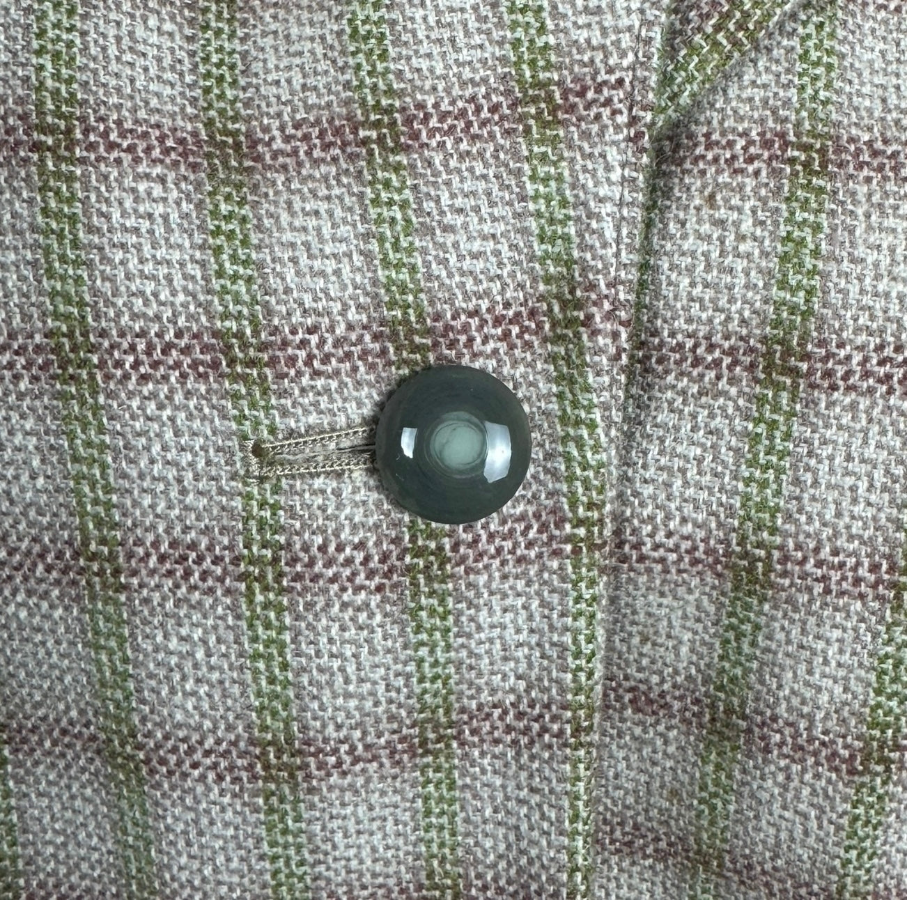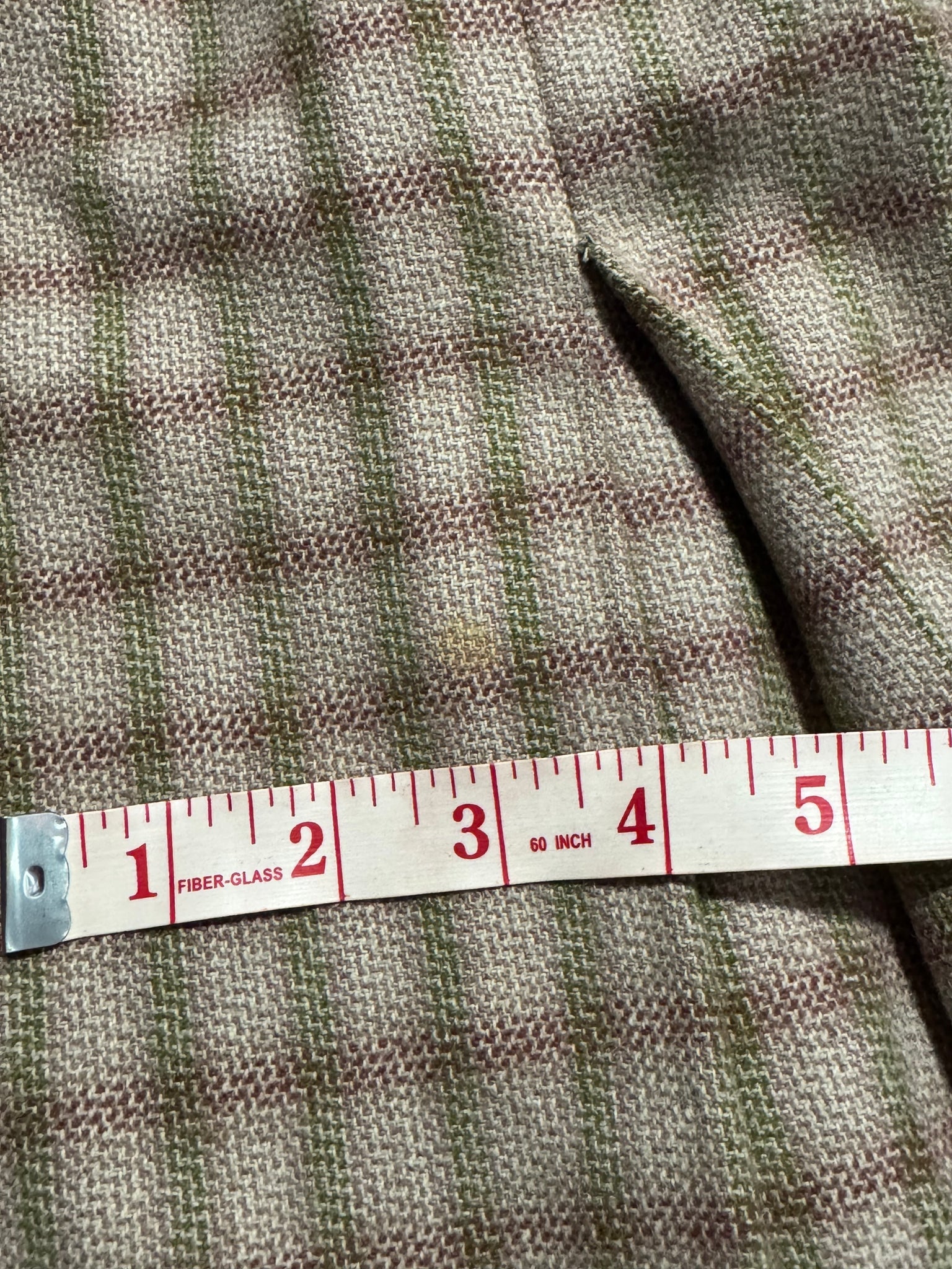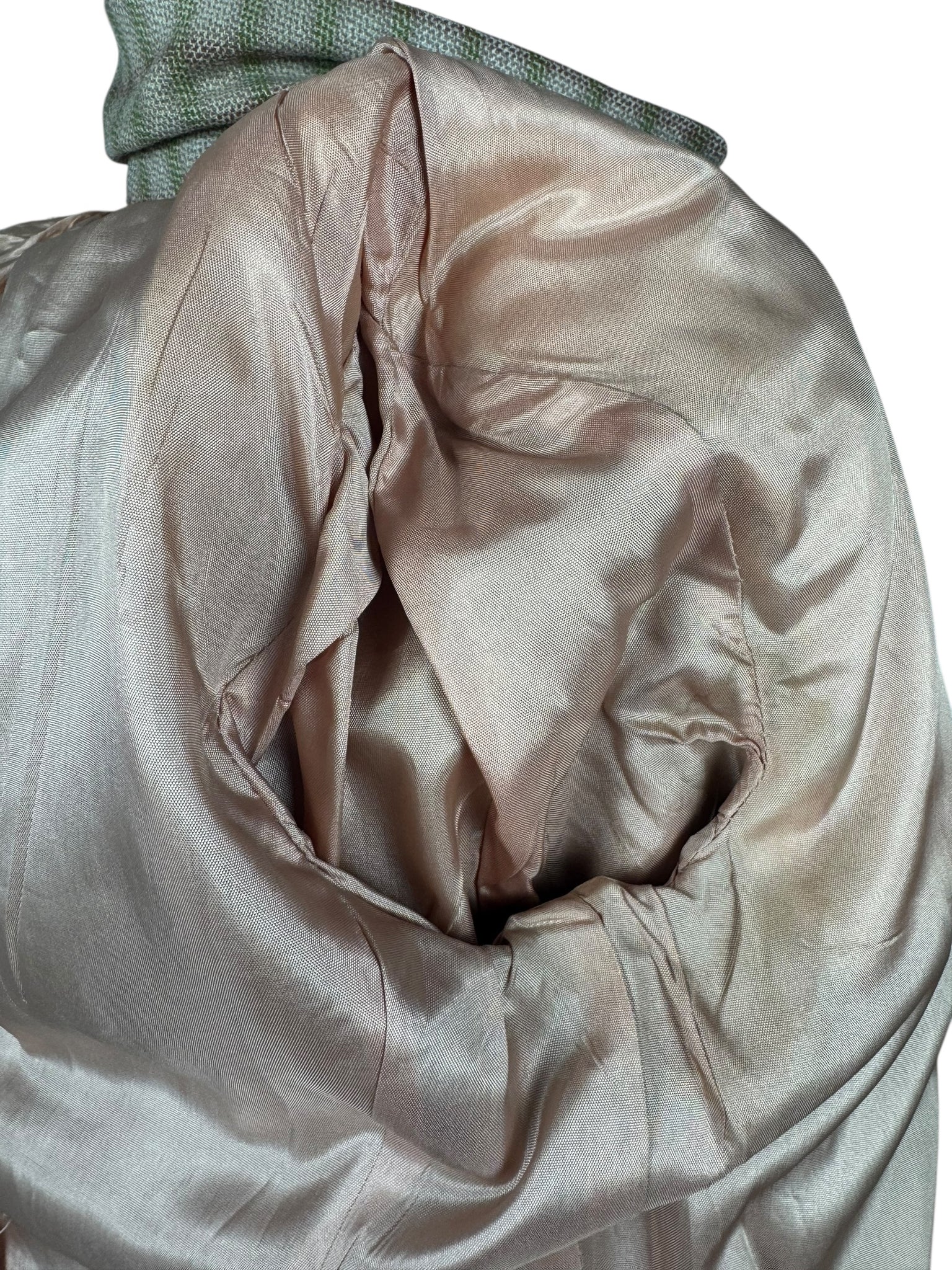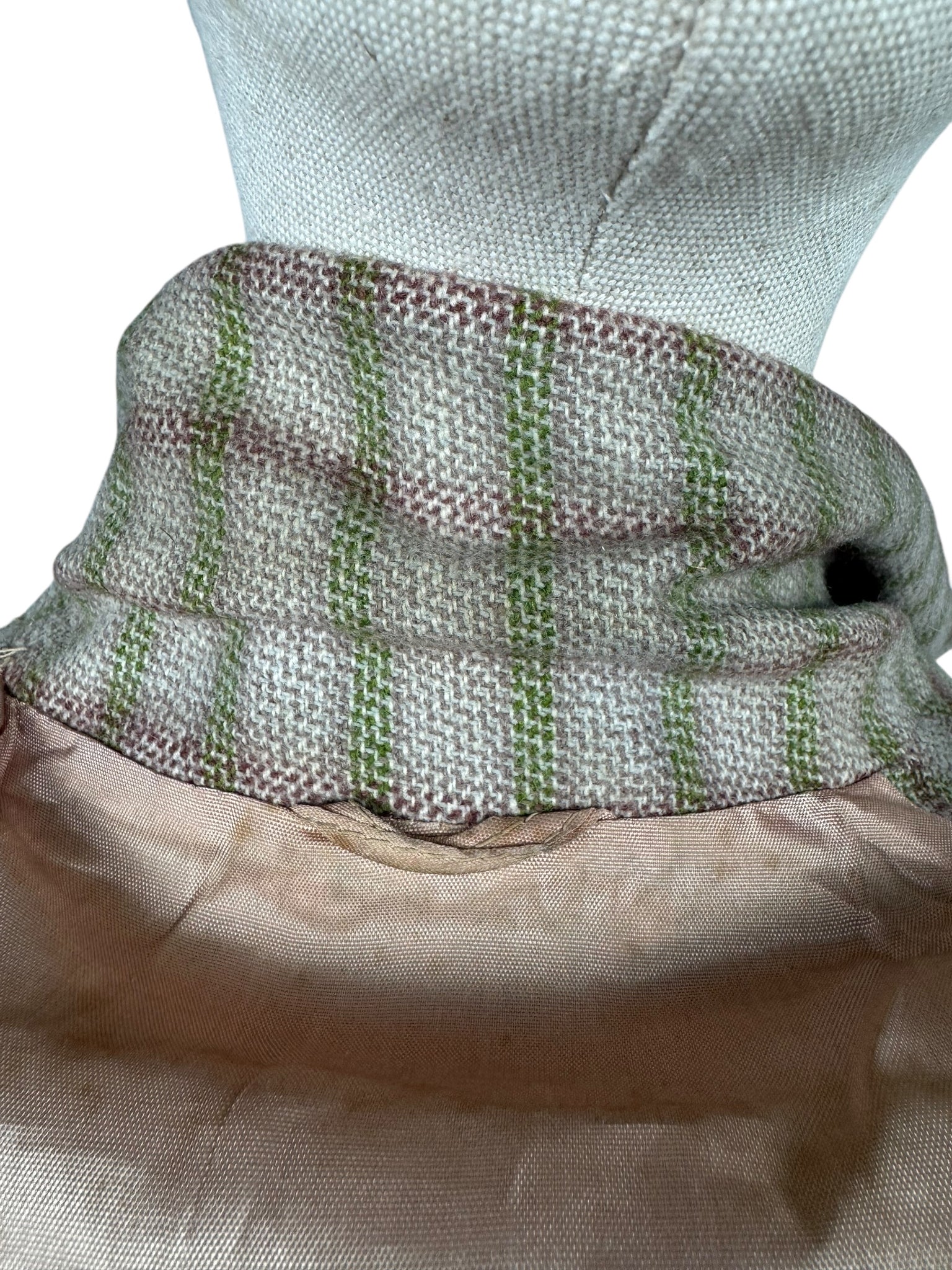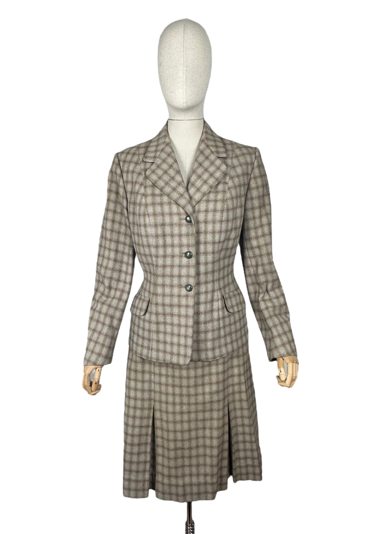 Made from medium weight wool it features a green and burgundy check on an off-white and dusky pink base. The jacket is beautifully tailored and features green button closure, has firm shoulder pads to give you the classic silhouette of the era and is fully.