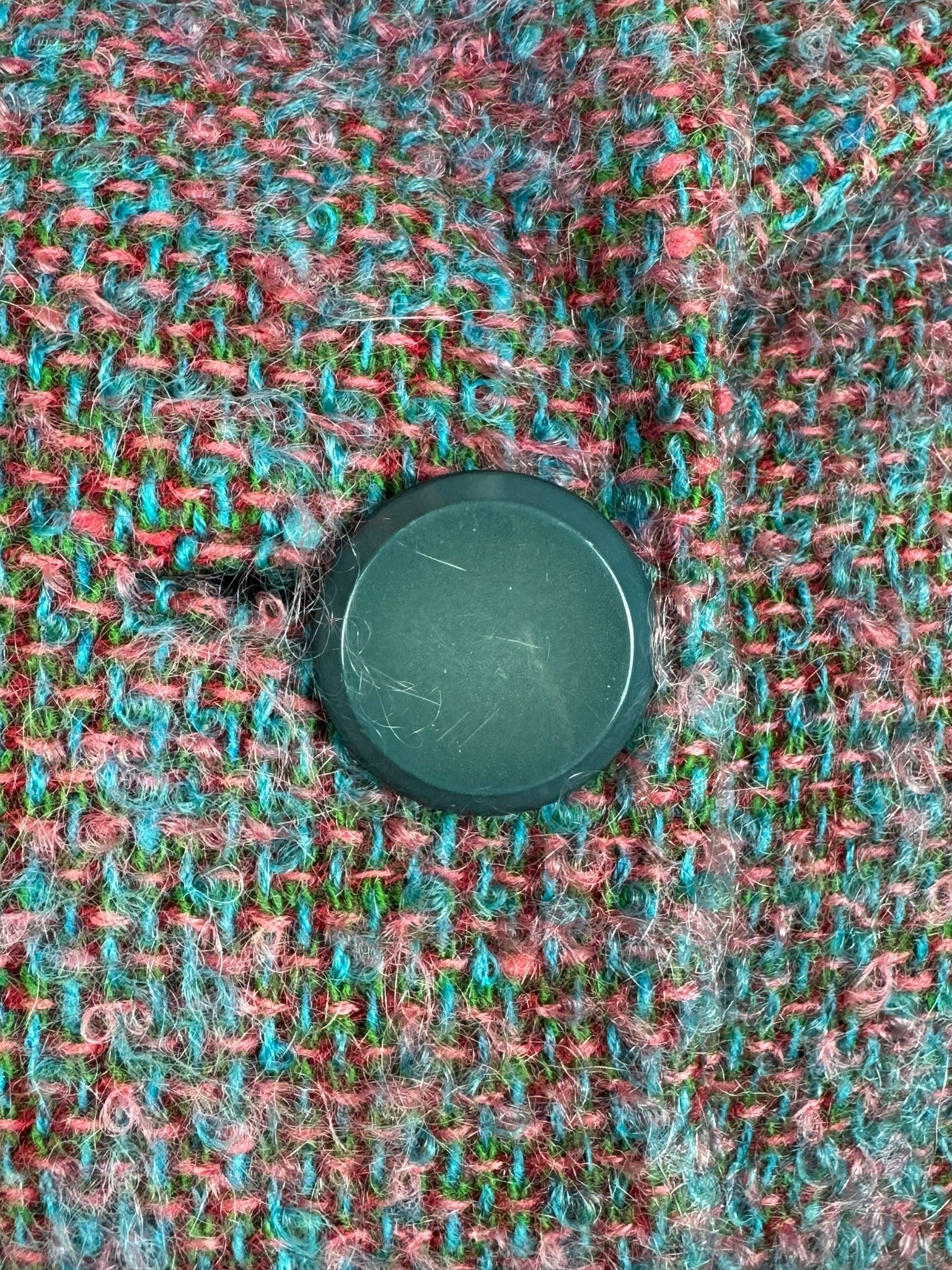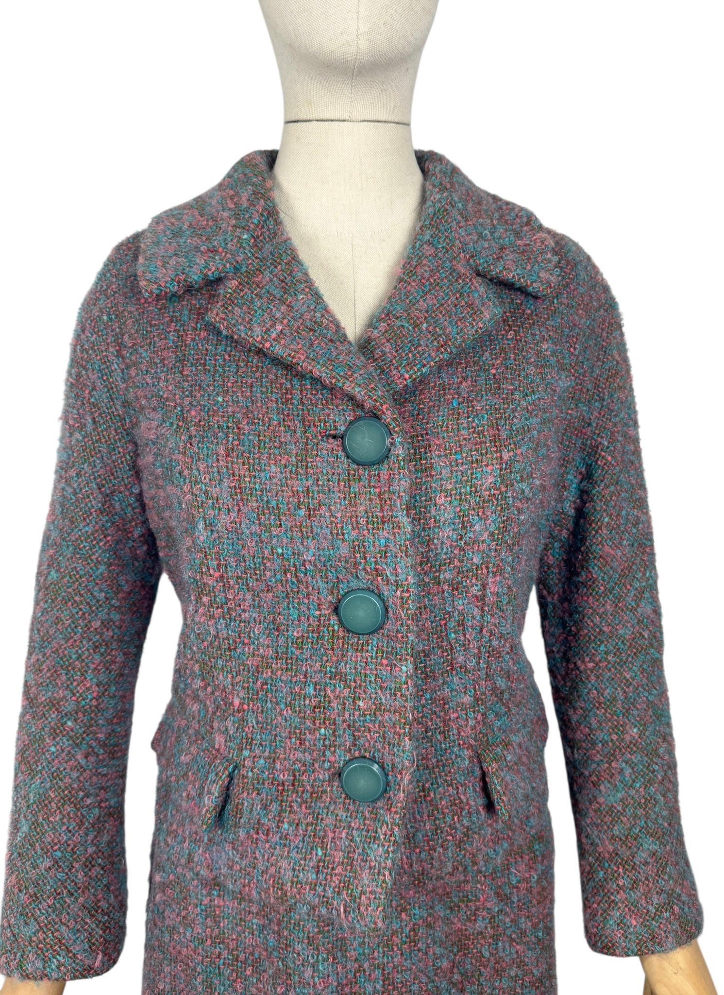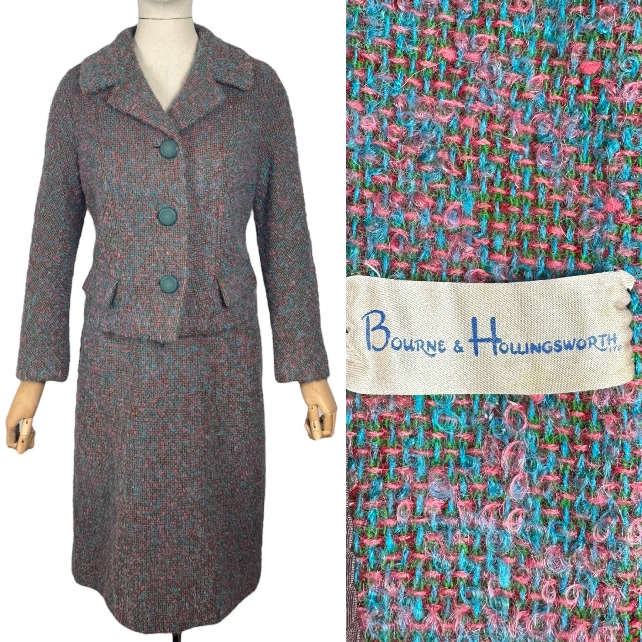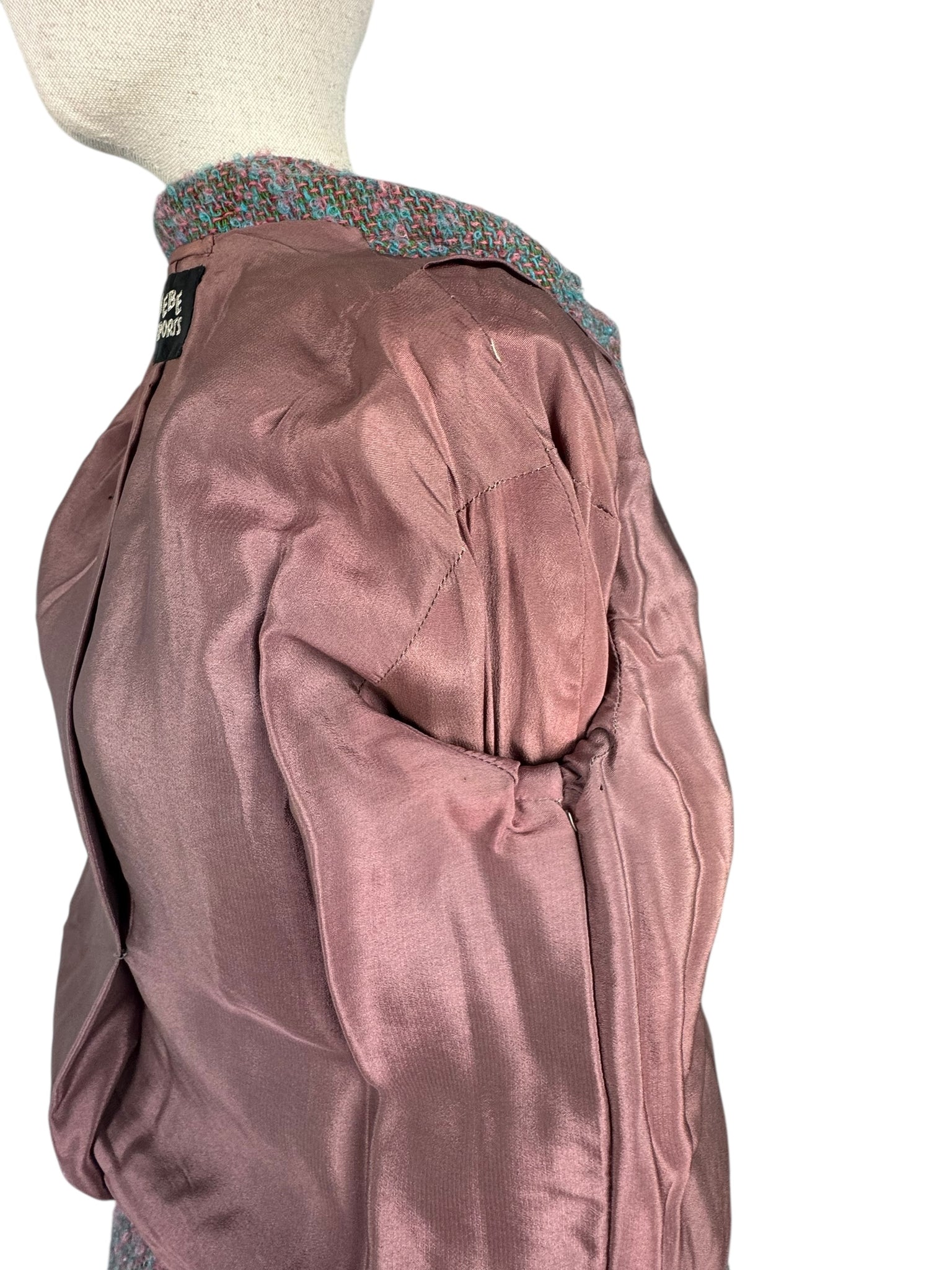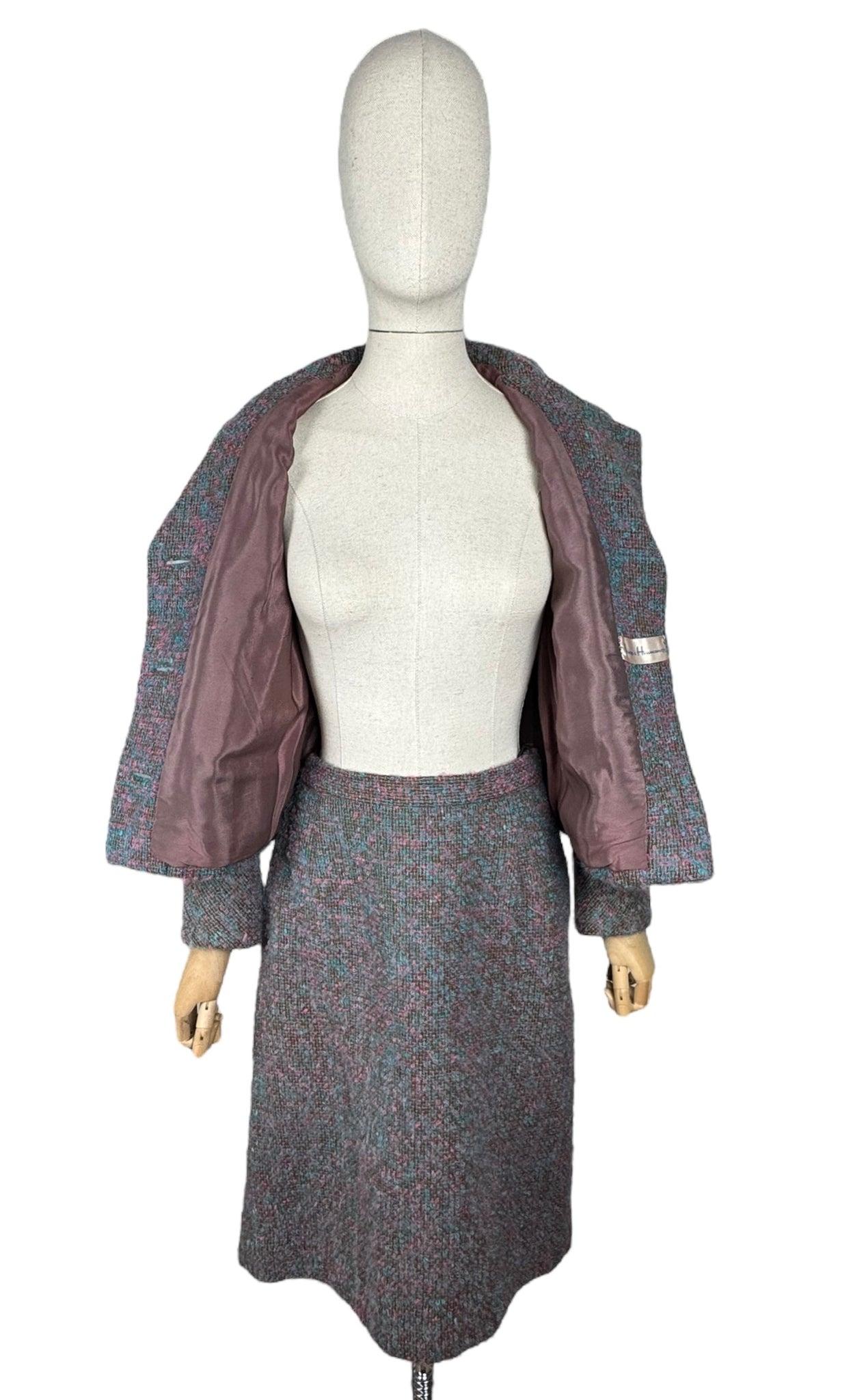 Made from loose weave textured wool in bright blue, pink, green and red it is perfect for the cooler months. Featuring a boxy jacket, fully lined with crepe, it has a three button closure and two small pockets. The skirt is slim fitting, fastens with a hook and zip closure on the left side and is lined in the seat only.
