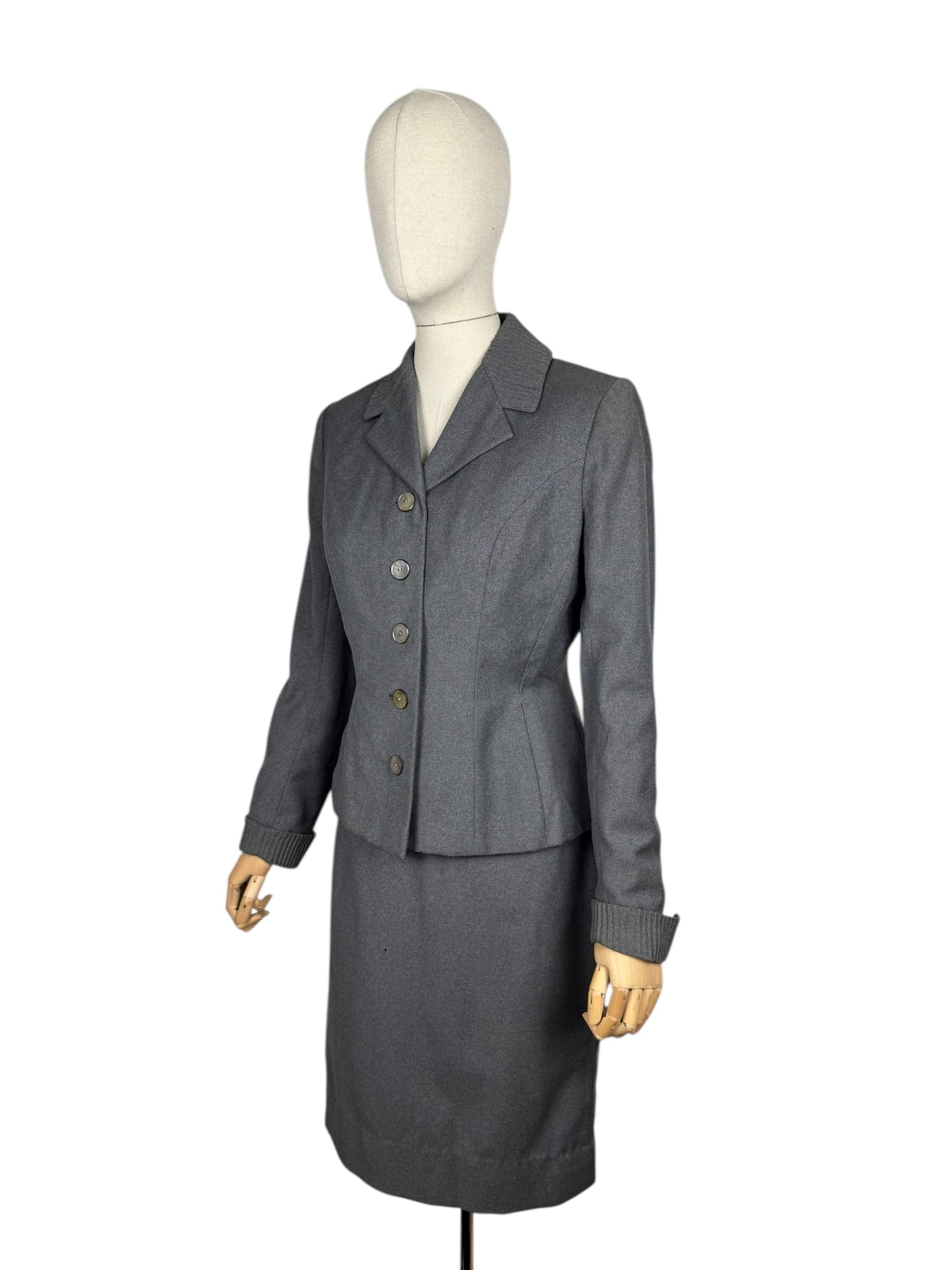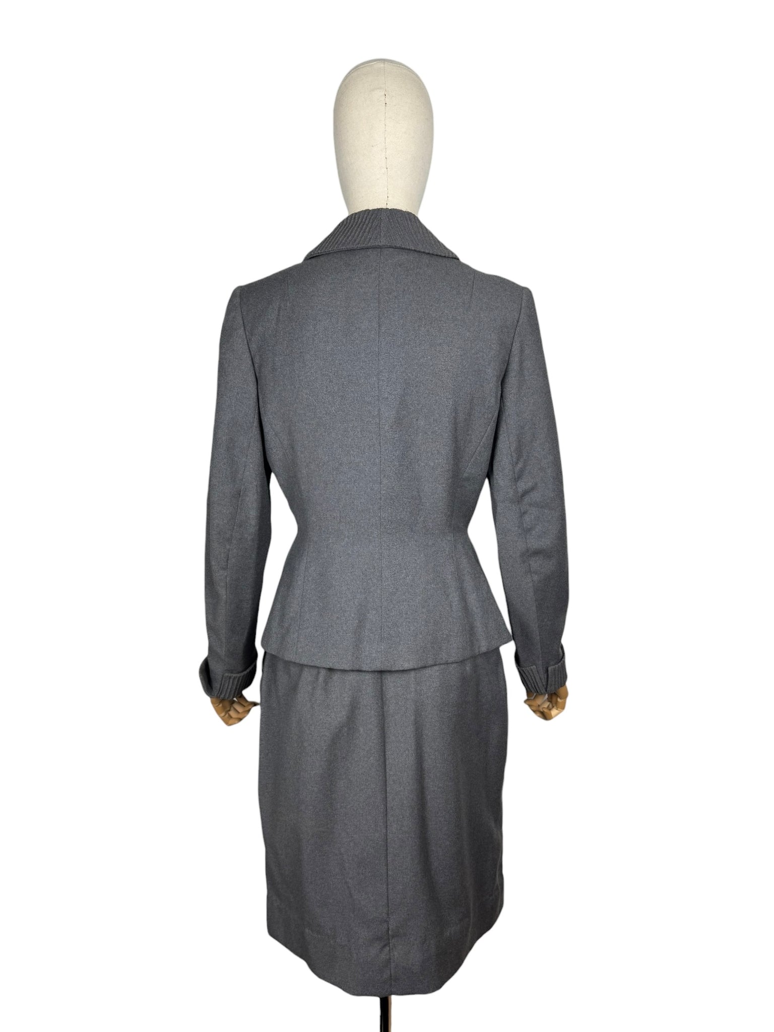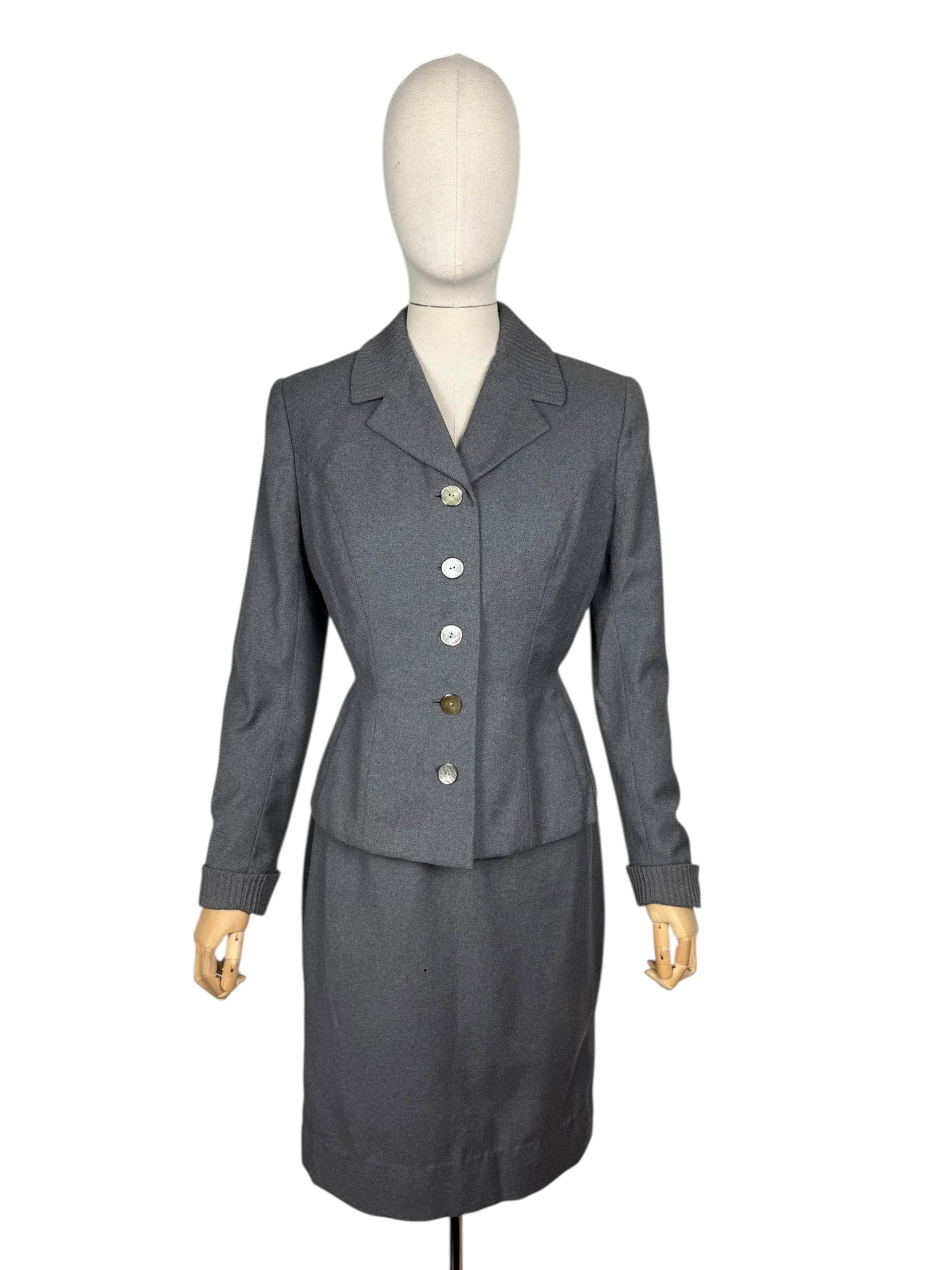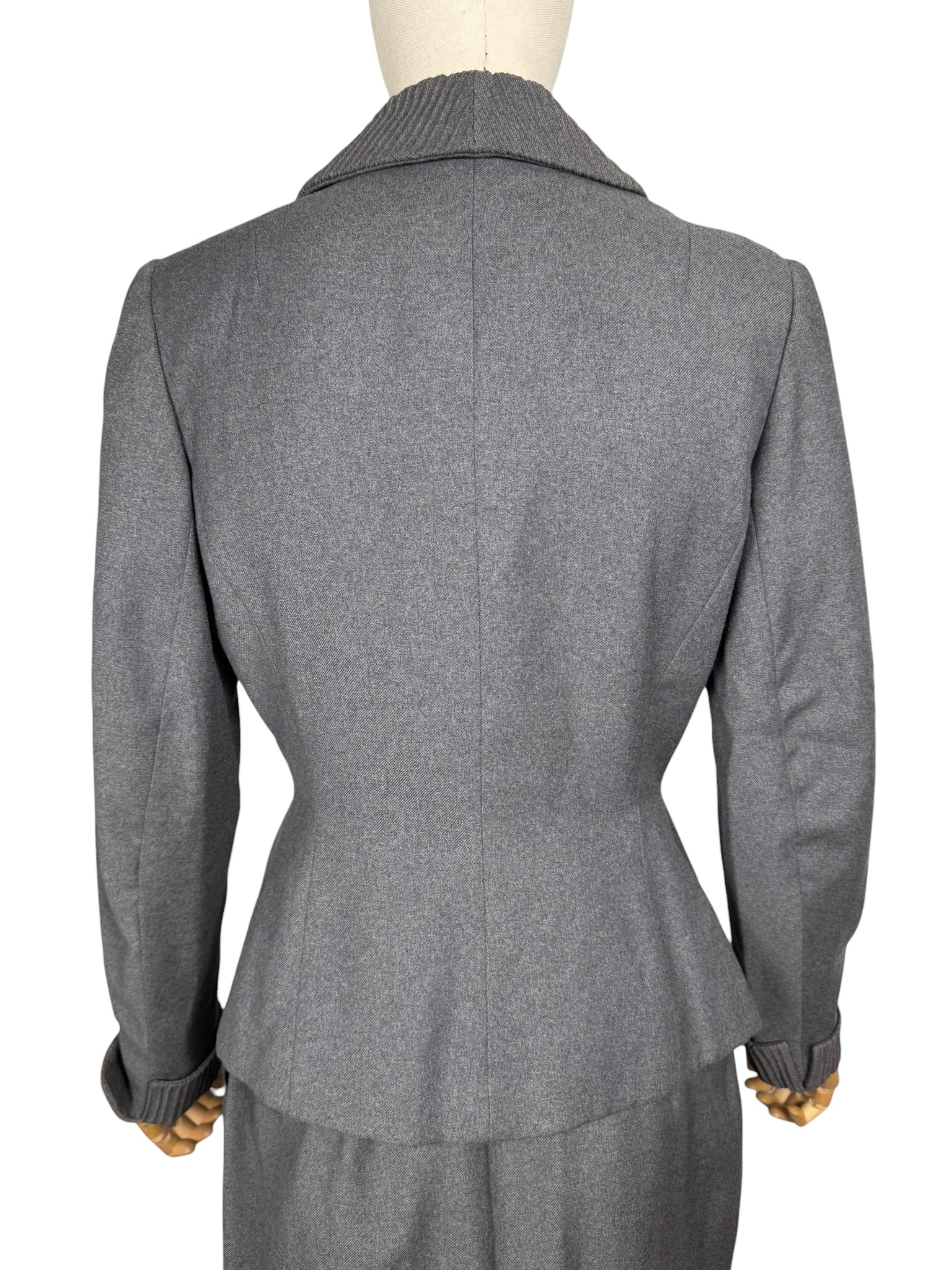 Made from grey worsted wool, which is smooth to the touch, it has a fitted jacket, with a nipped waist, fastens with five mother of pearl buttons and has pleated cuffs and collar. The skirt is simply tailored and fastens on the left side with 2 hooks and a metal zip. The jacket is fully lined with grey crepe, the skirt is unlined.
