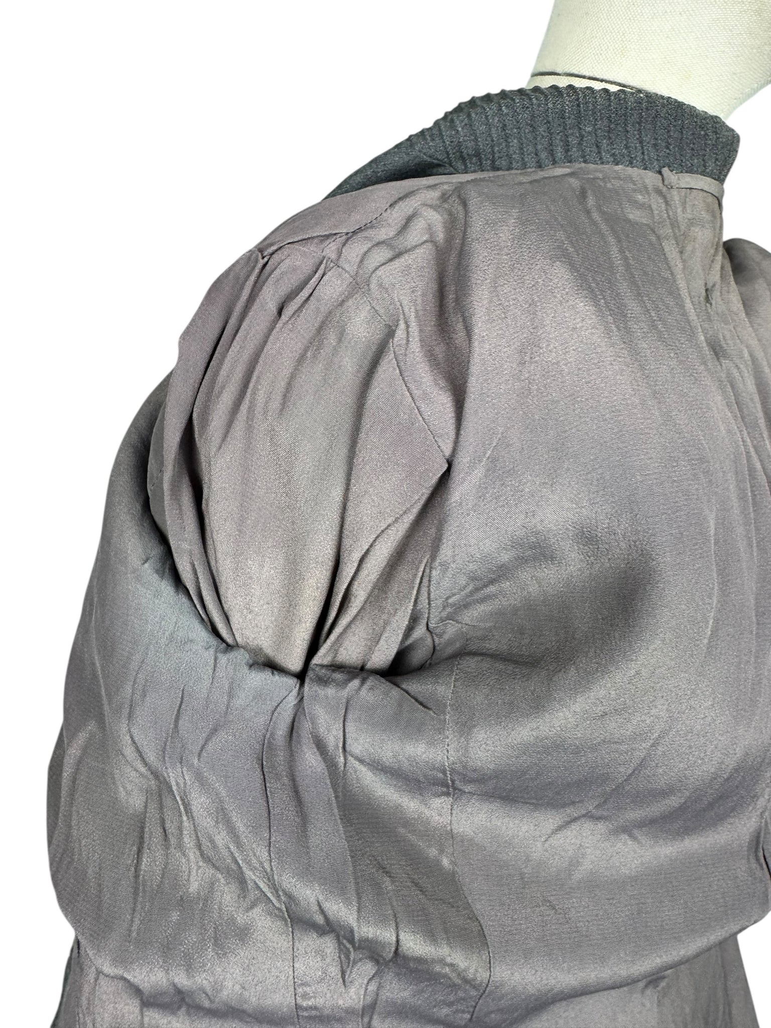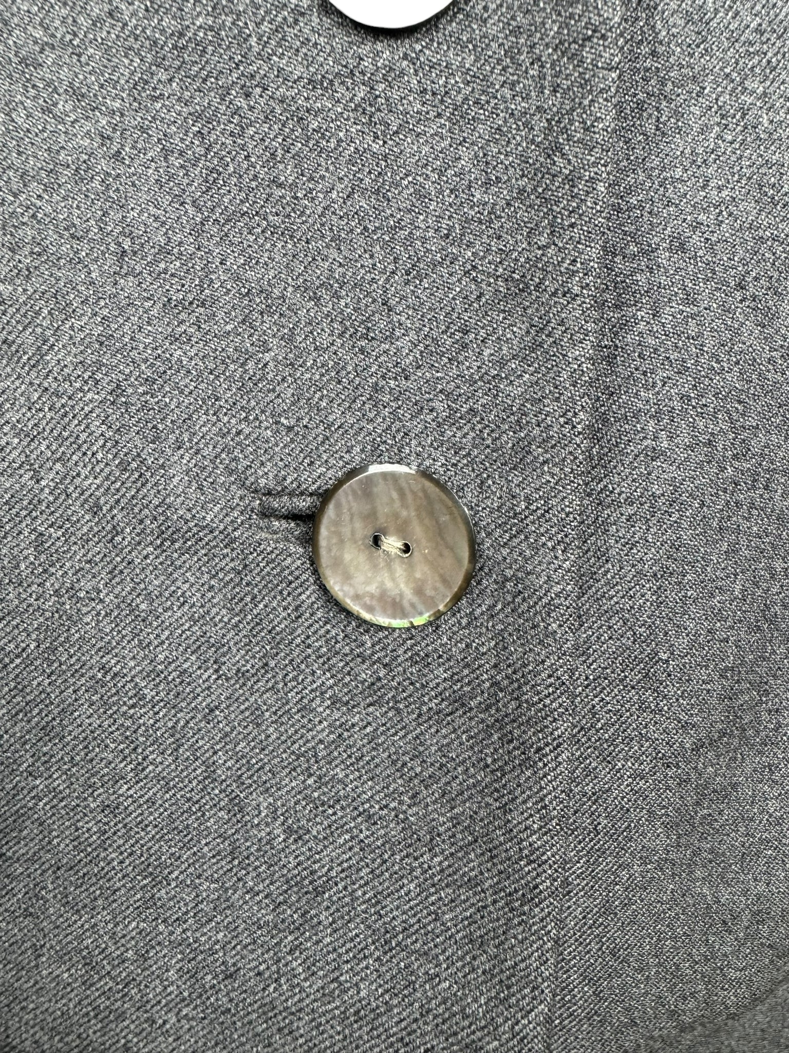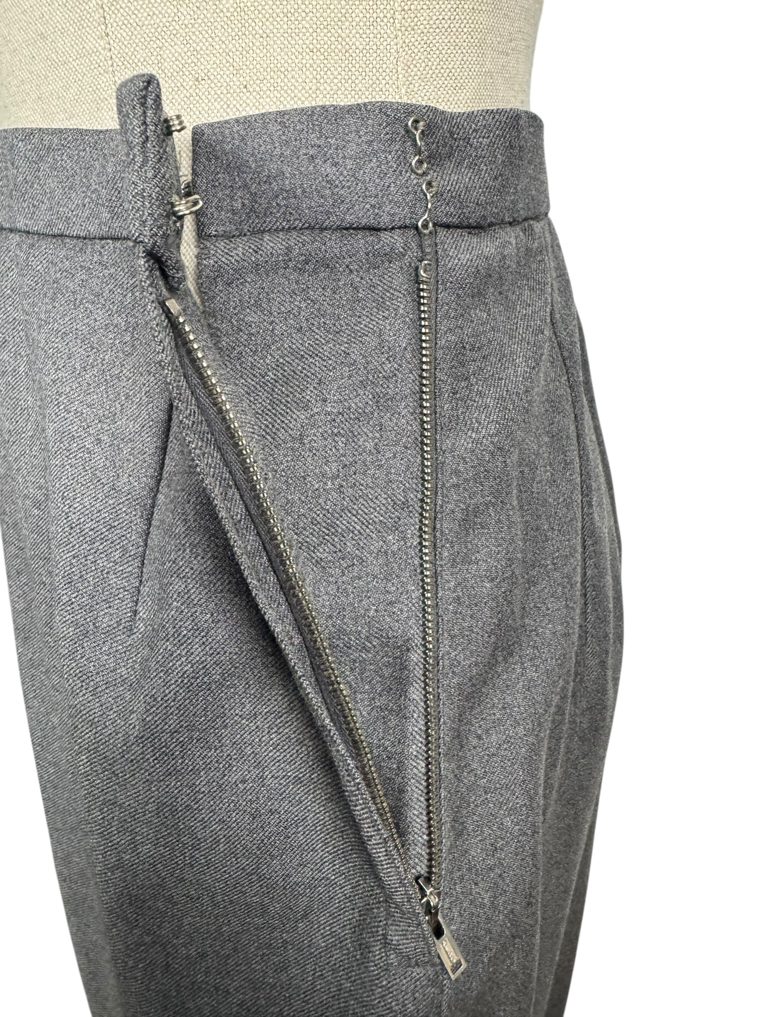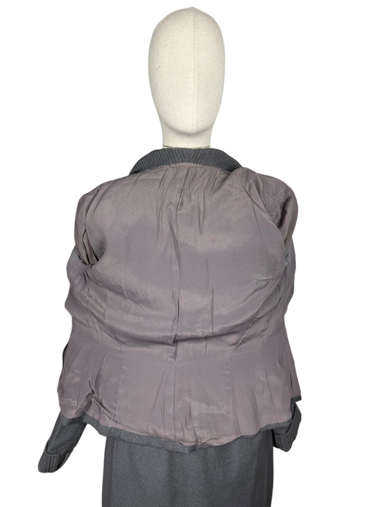 Made from grey worsted wool, which is smooth to the touch, it has a fitted jacket, with a nipped waist, fastens with five mother of pearl buttons and has pleated cuffs and collar. The skirt is simply tailored and fastens on the left side with 2 hooks and a metal zip. The jacket is fully lined with grey crepe, the skirt is unlined.