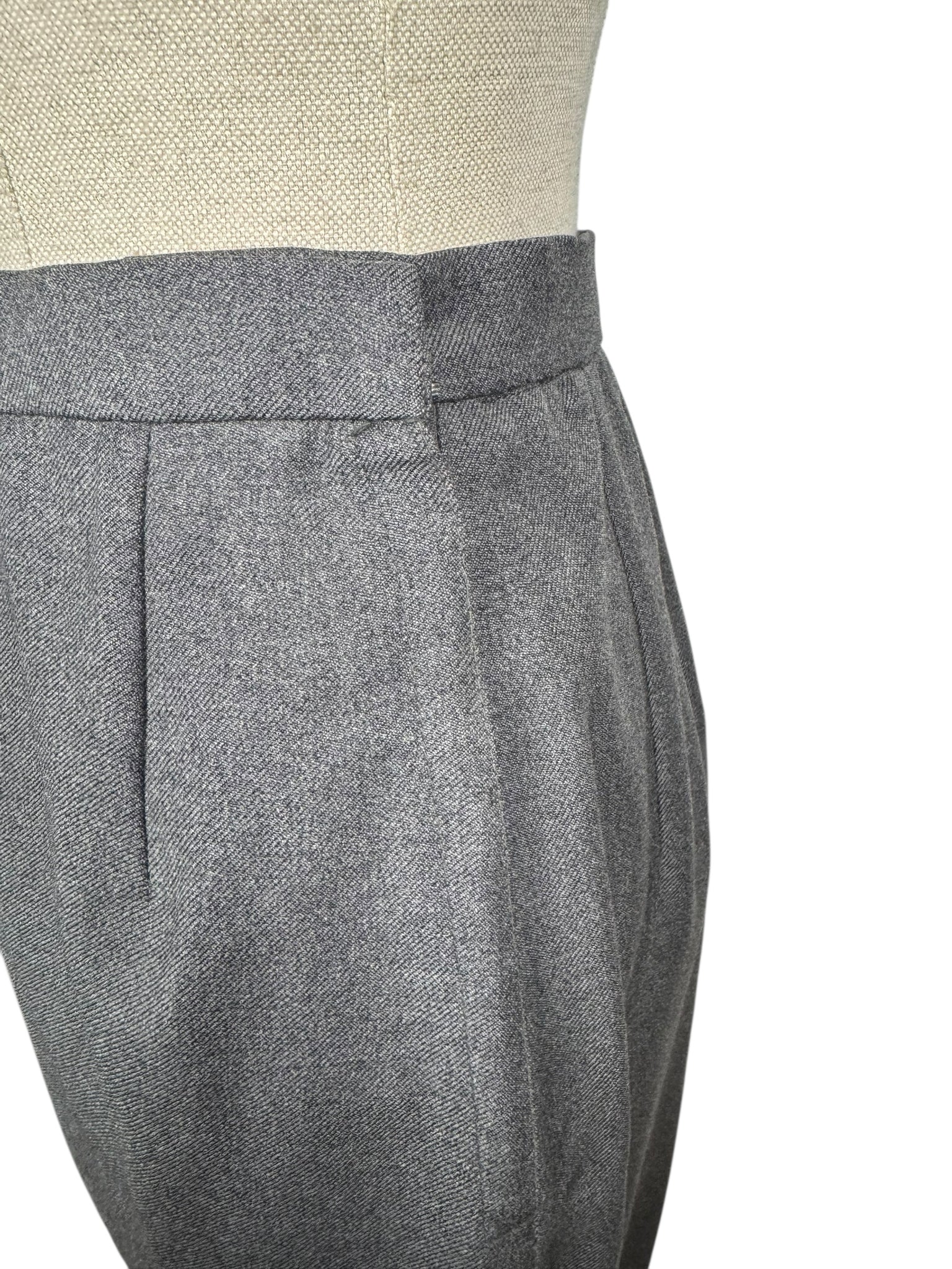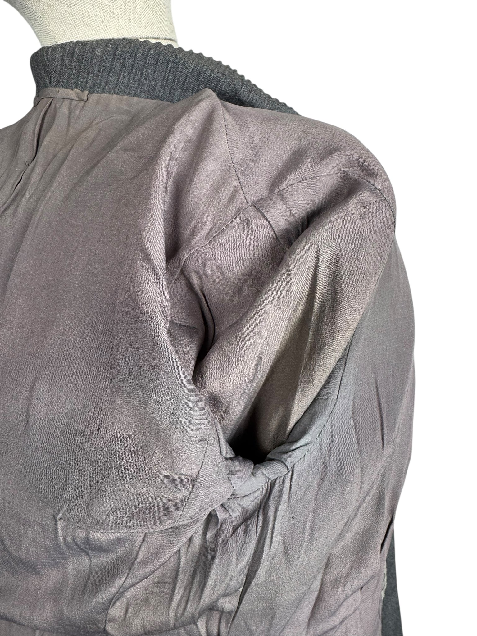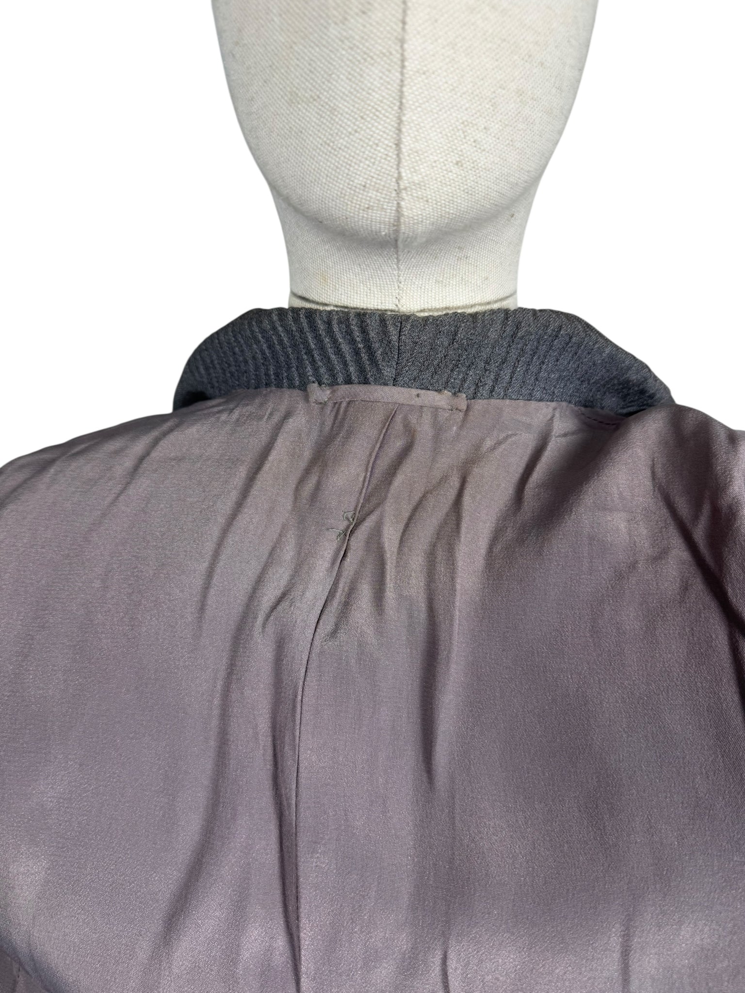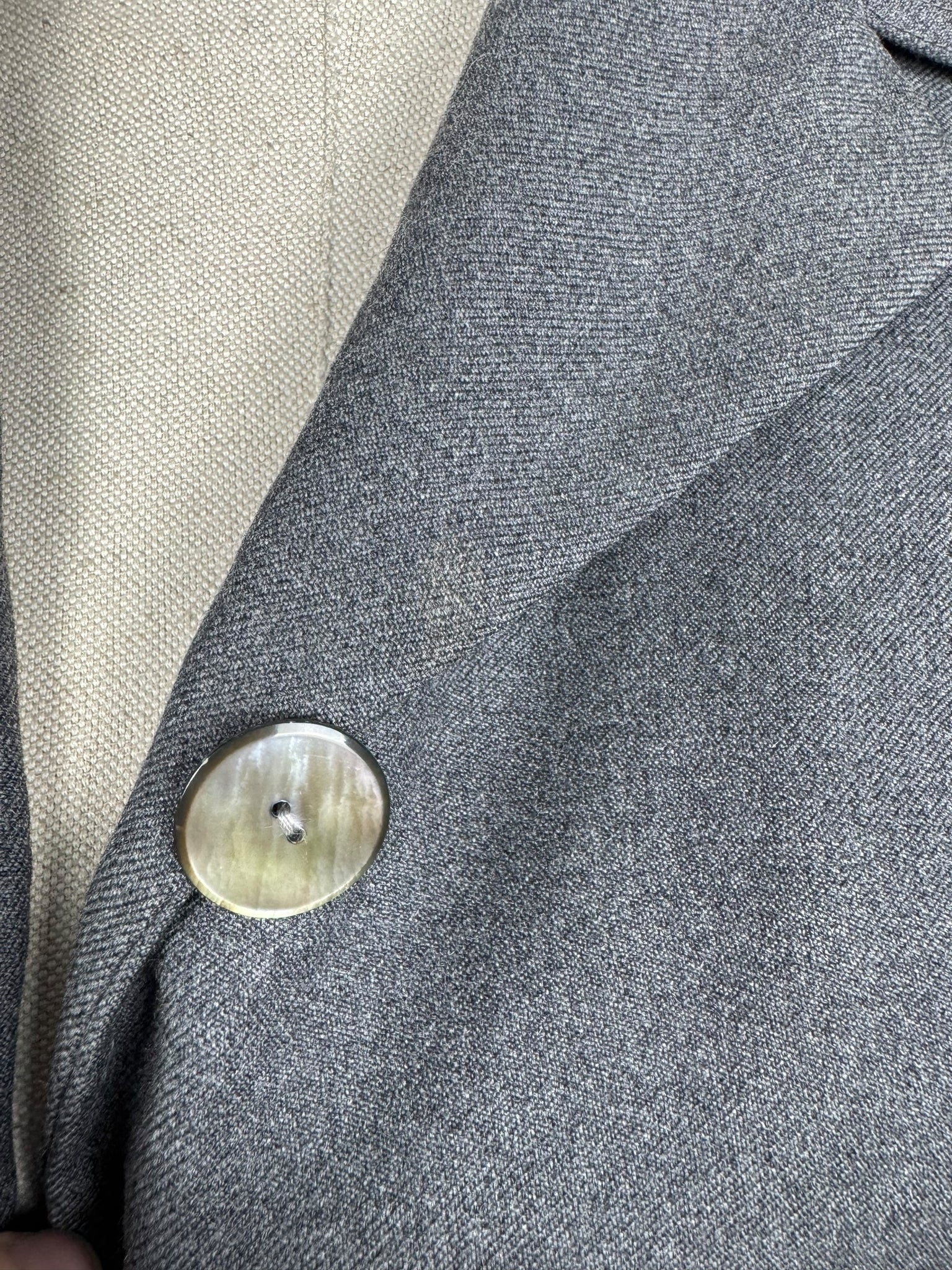 Made from grey worsted wool, which is smooth to the touch, it has a fitted jacket, with a nipped waist, fastens with five mother of pearl buttons and has pleated cuffs and collar. The skirt is simply tailored and fastens on the left side with 2 hooks and a metal zip. The jacket is fully lined with grey crepe, the skirt is unlined.