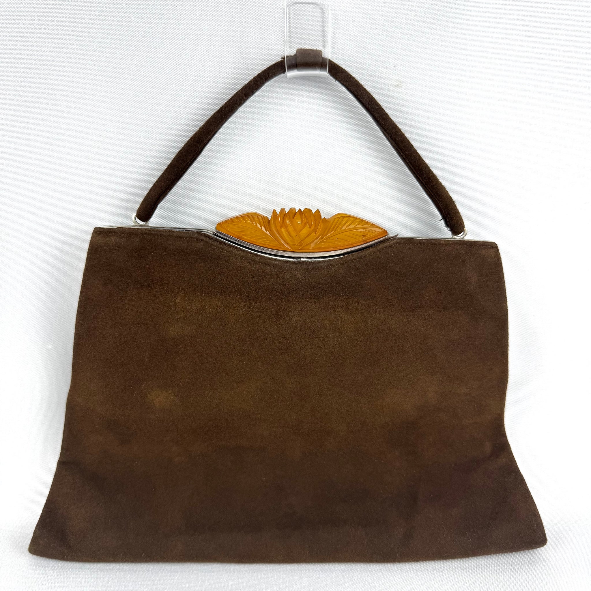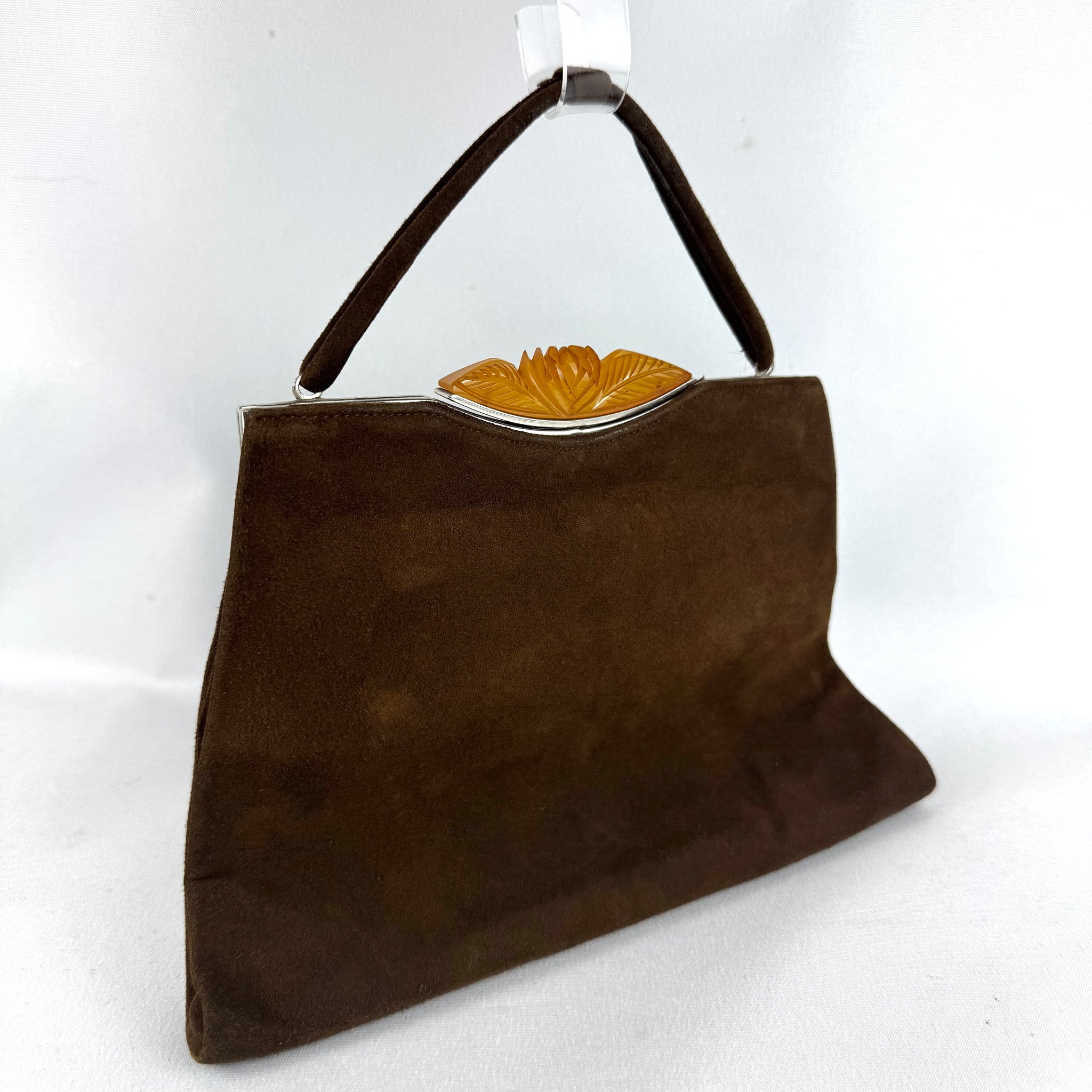 Made from soft suede in a warm brown it is a classic shape of the time. With a white metal frame it has a large carved clasp featuring a rose and two leaves. It has a single handle and is fully lined with brown satin. The inner has two side pockets, a lipstick pocket and a two-tone coin section.