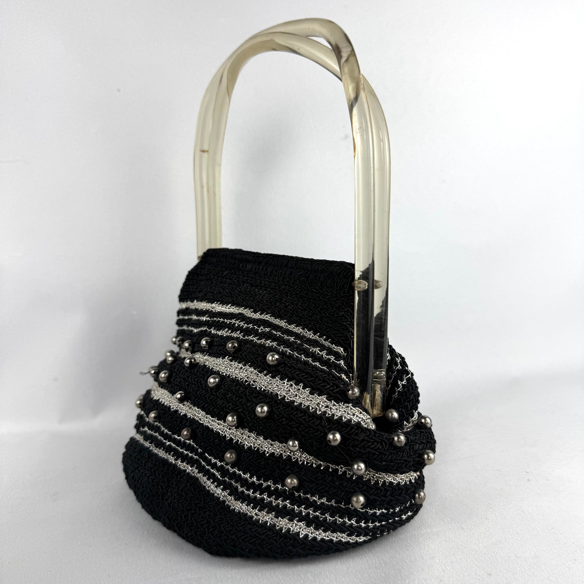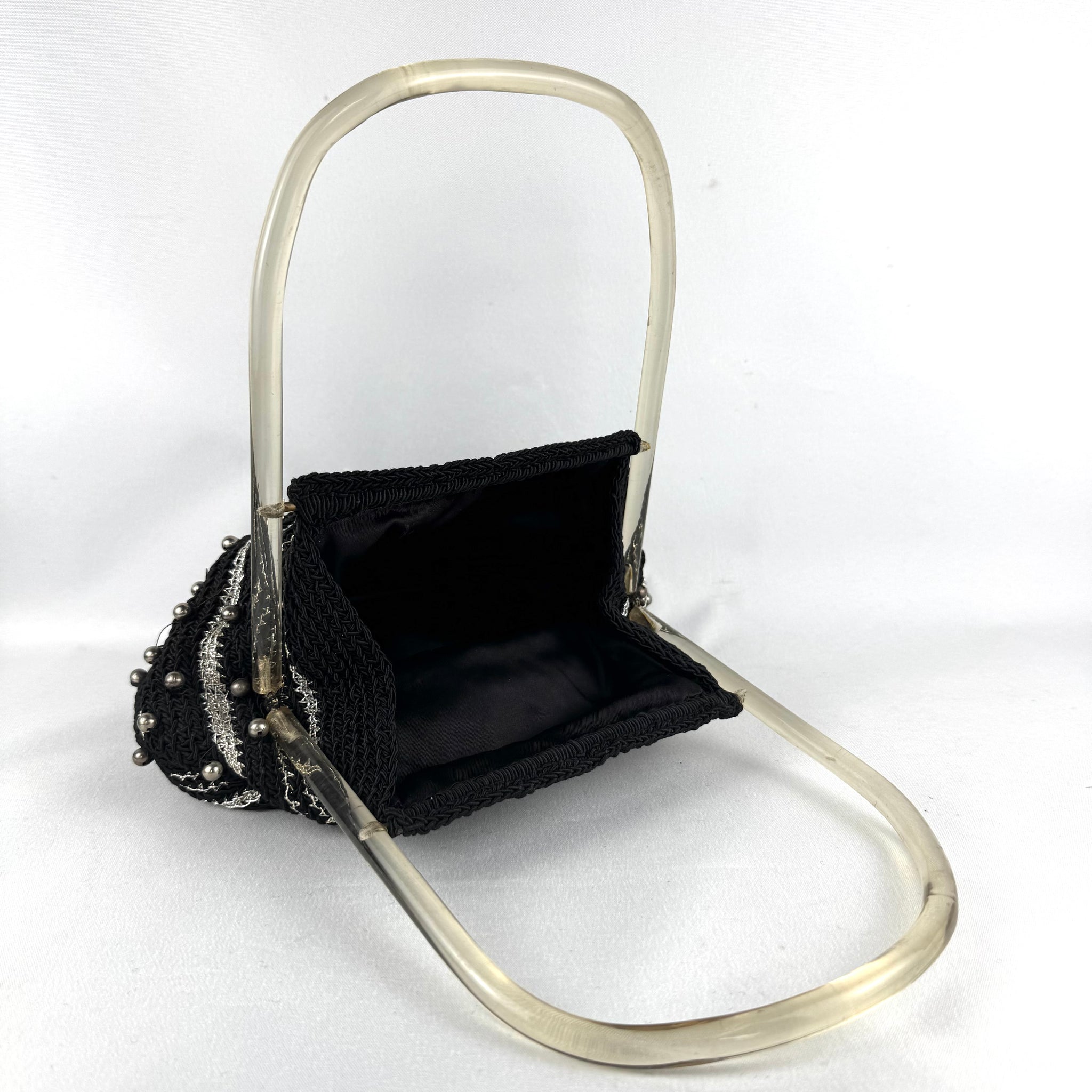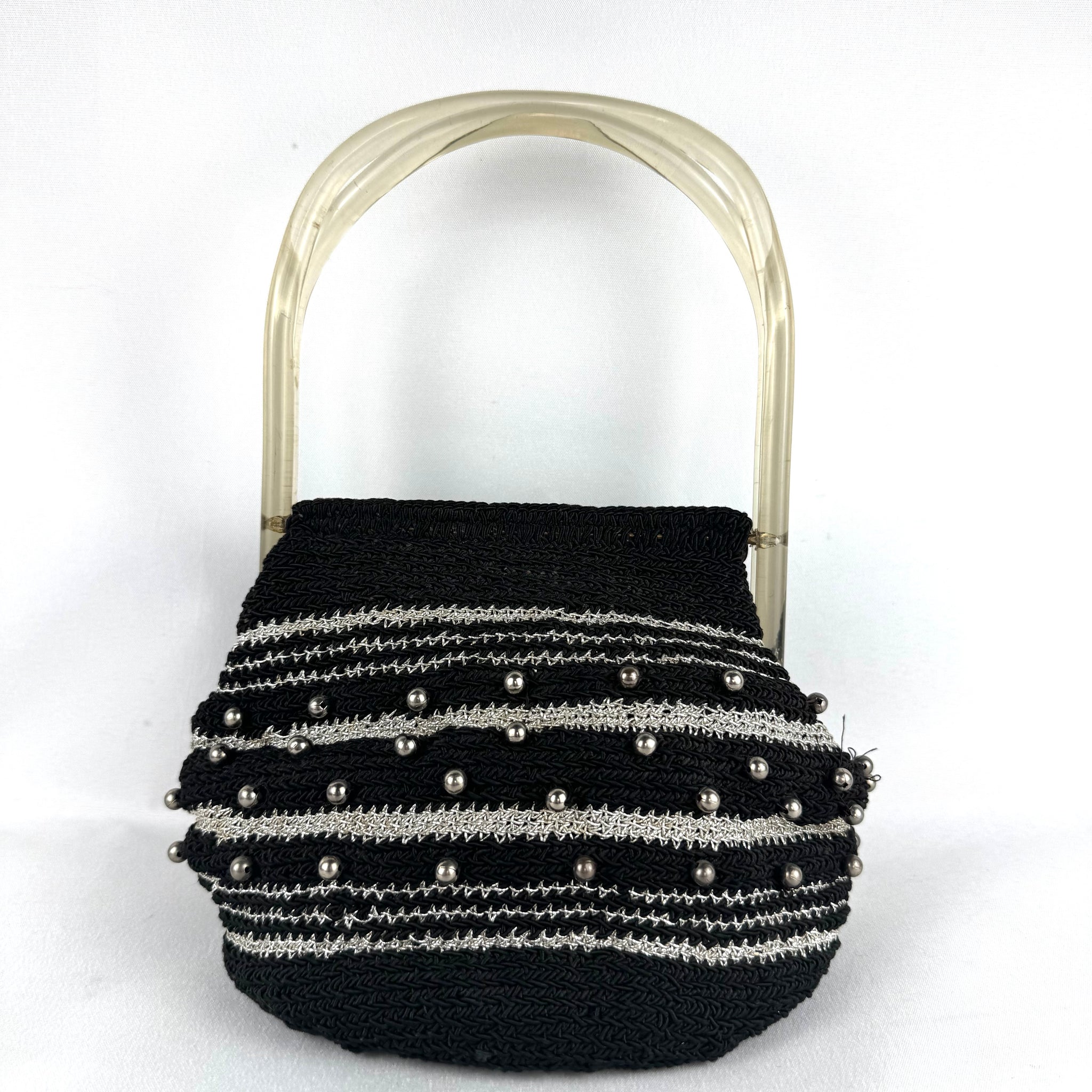 The body of the bag is crochet in black cotton with silver accent bands. It is trimmed with metal beads and has large Lucite handles which clip together to keep the bag close.