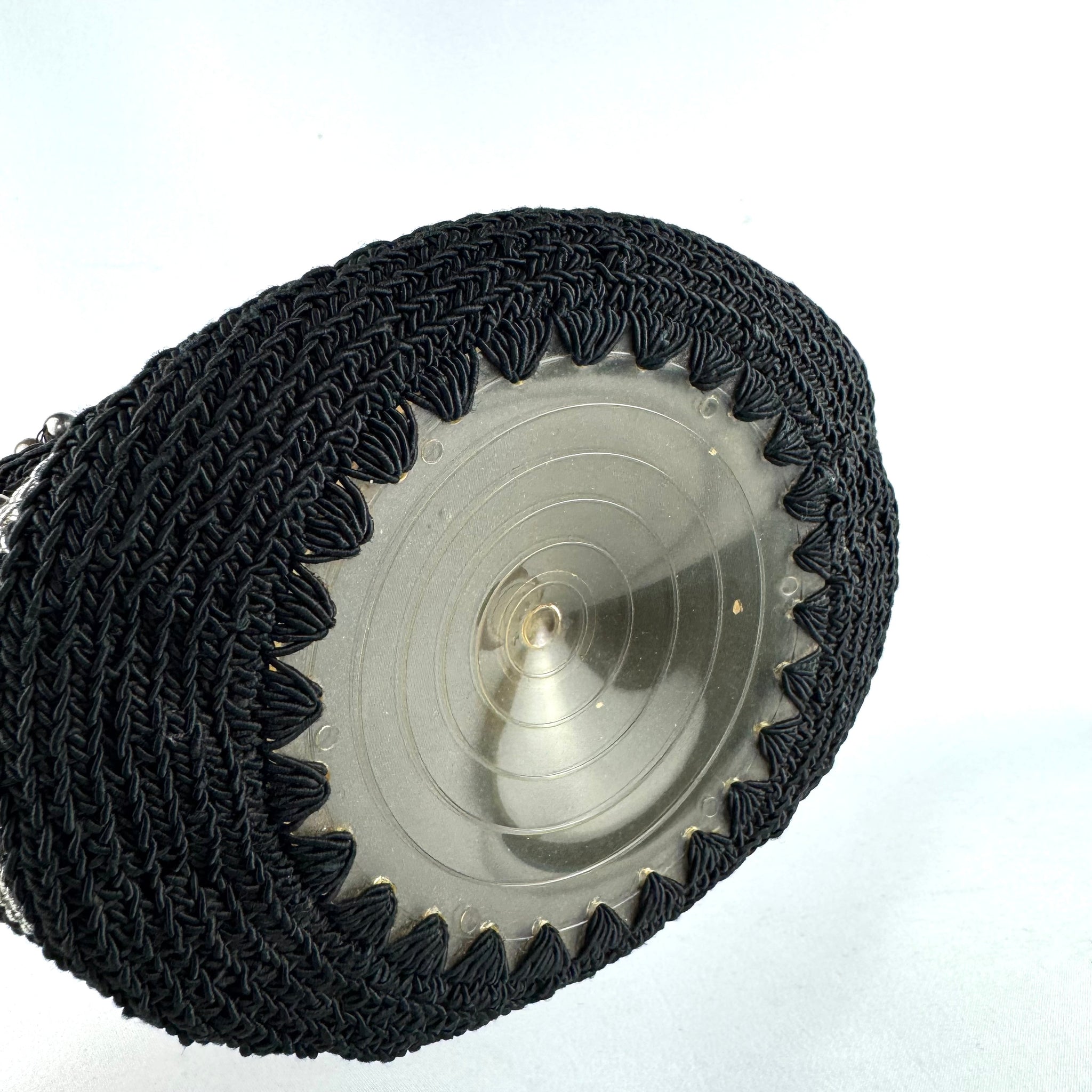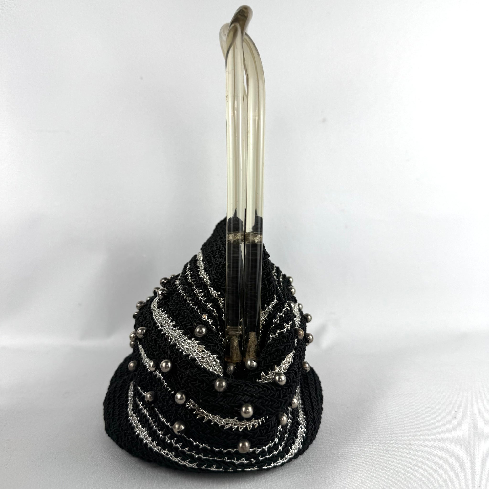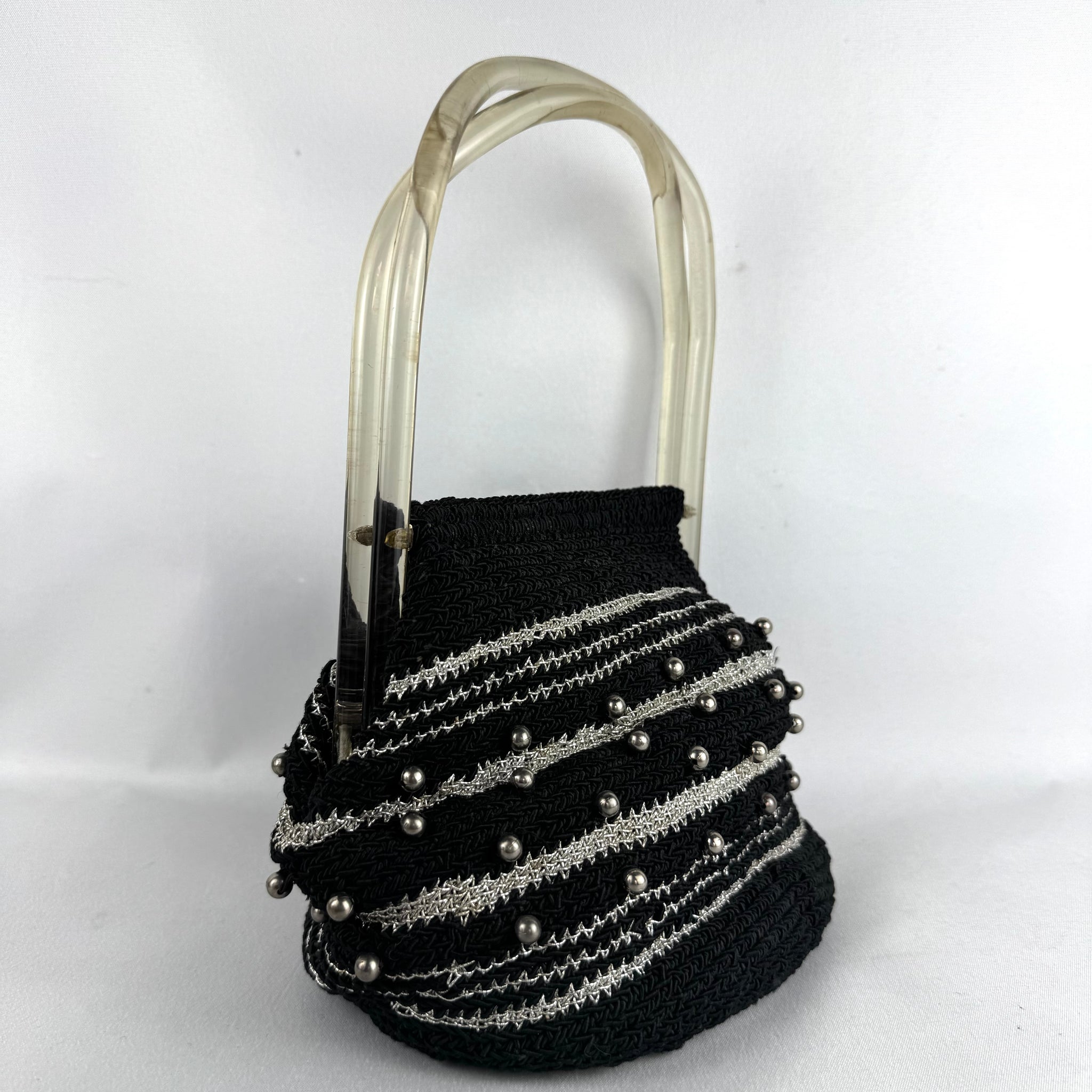 The body of the bag is crochet in black cotton with silver accent bands. It is trimmed with metal beads and has large Lucite handles which clip together to keep the bag close.